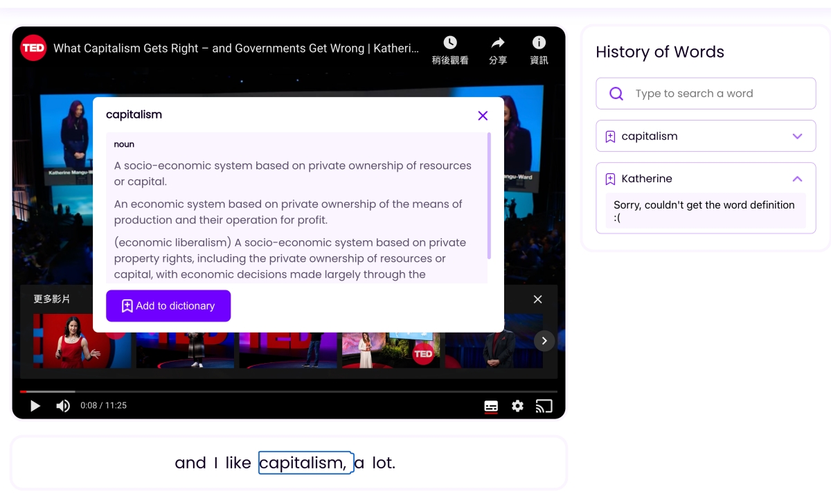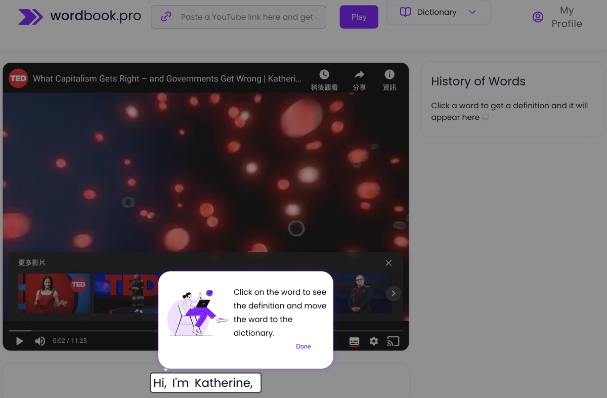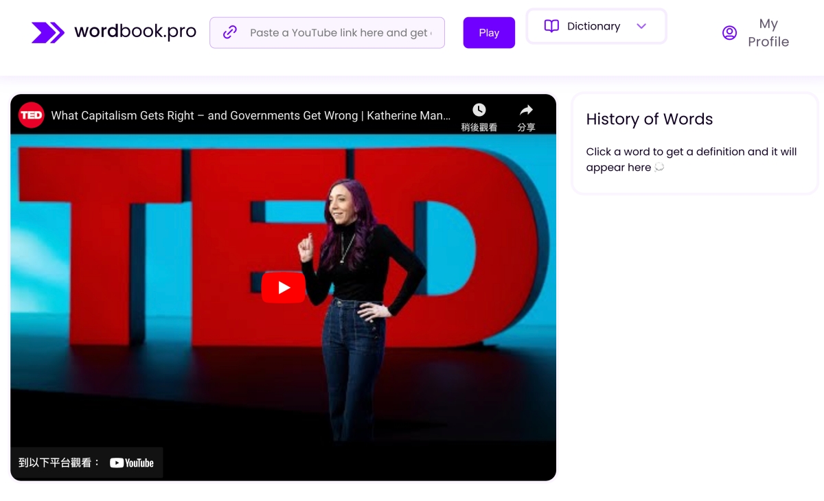 阿湯以前學英文時,有一段時期很喜歡看 TED 的 YouTube 影片學,除了練習聽力外,主要是因為 TED 的 YouTube 影片大多都有英文字幕可以對照,這樣聽不懂的字至少有對照可以去查一下字義,但是一來一往查詢也是挺麻煩,今天來分享個 Wordbook.pro 線上工具,只要在這裡輸入 YouTube 影片網址觀看,就可以同步顯示字幕,且當你遇到不懂的單字時,按一下就可以查看字義,還能加入學習清單,算是從 YouTube 學英文的好幫手。