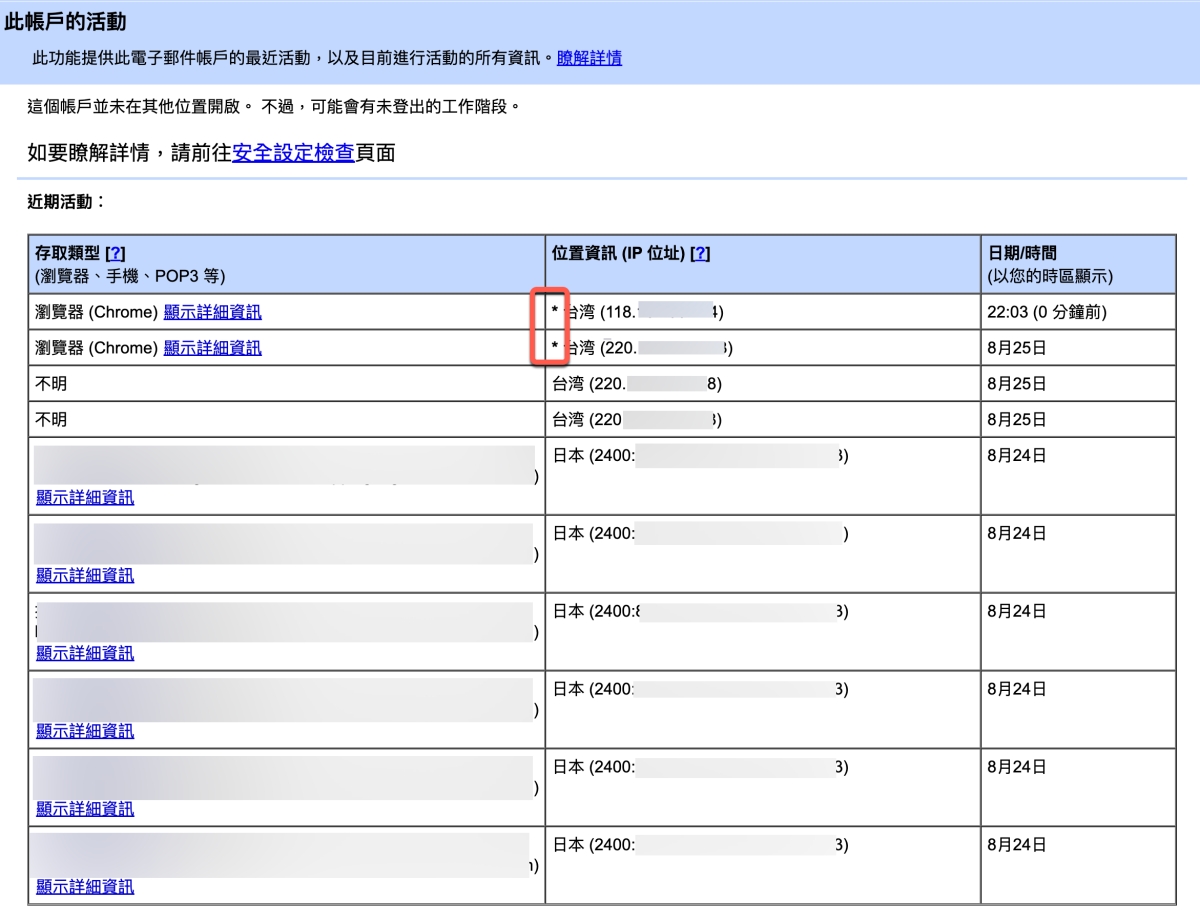 進來後就可以查看你最近的 Gmail 活動記錄,會顯示使用什麼裝置,位置 IP 以及日期時間,那麼你就可以回憶一下這些時間是否都你開啟的,而在位置資訊前如果有出現 * 符號的話,代表是現在進行式,你只要對照一下自己的 IP,就知道除了你之外是不是還有別人使用囉。