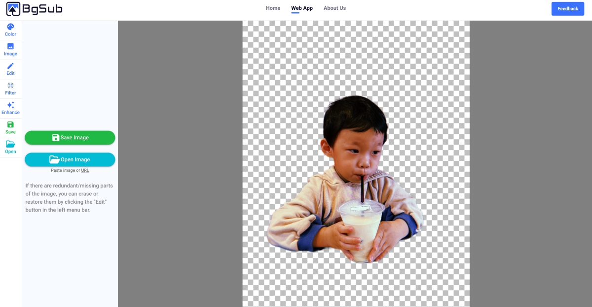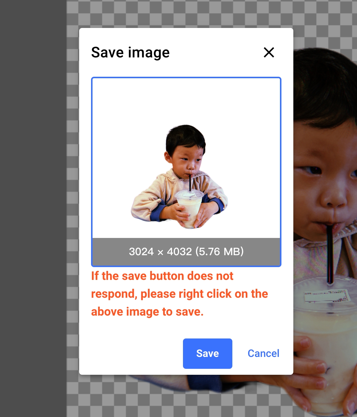 圖片拖進來後,立刻就可以完成去背,預設會進到這個畫面,左邊有些編輯功能可以用,如果不需要直接按 Save Image 就可以了。