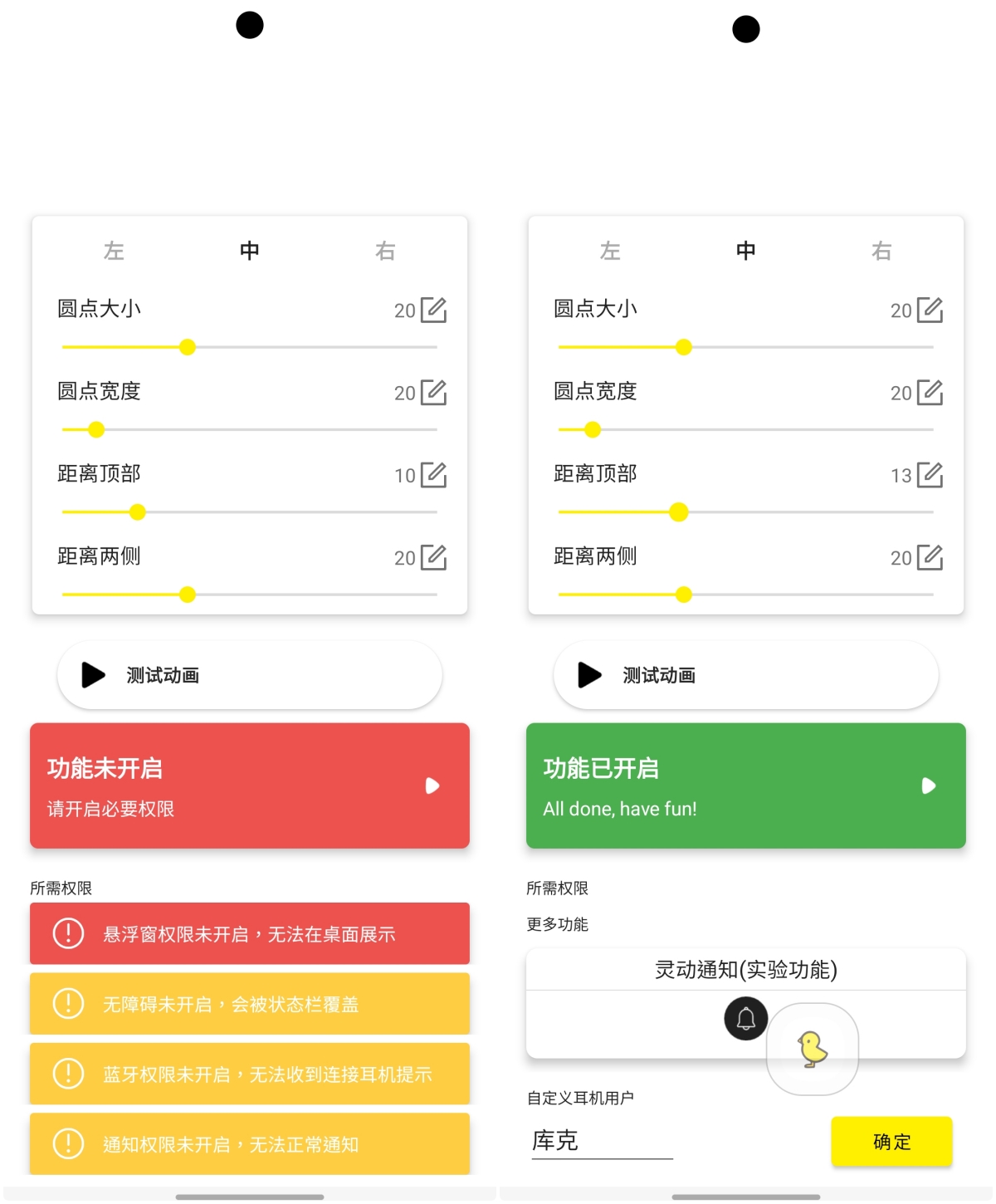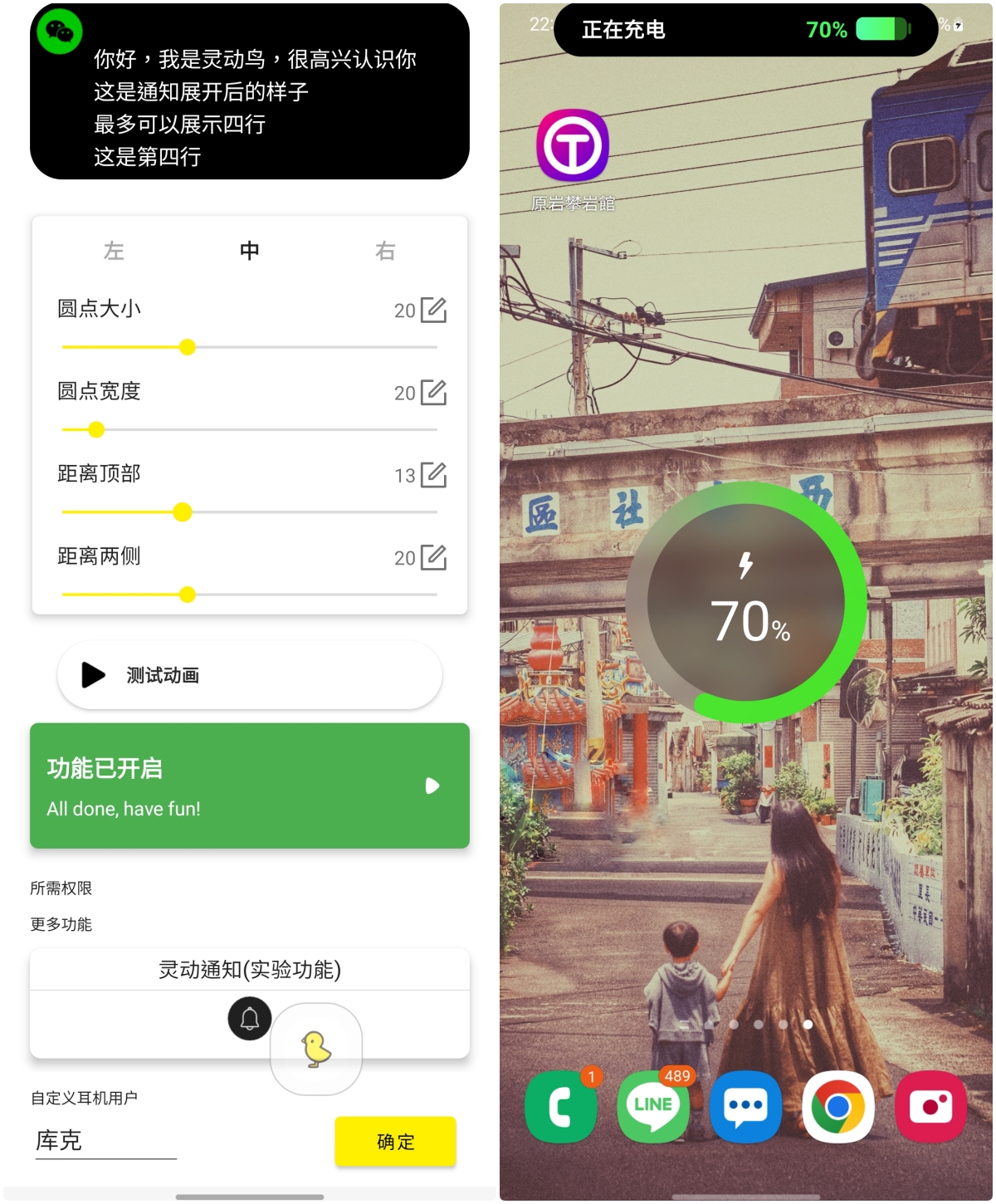 點擊測試動畫就可以看看效果,也可以調整位置,目前主要是充電、連接耳機、訊息這幾項會有動畫效果,來電目前是沒有的。