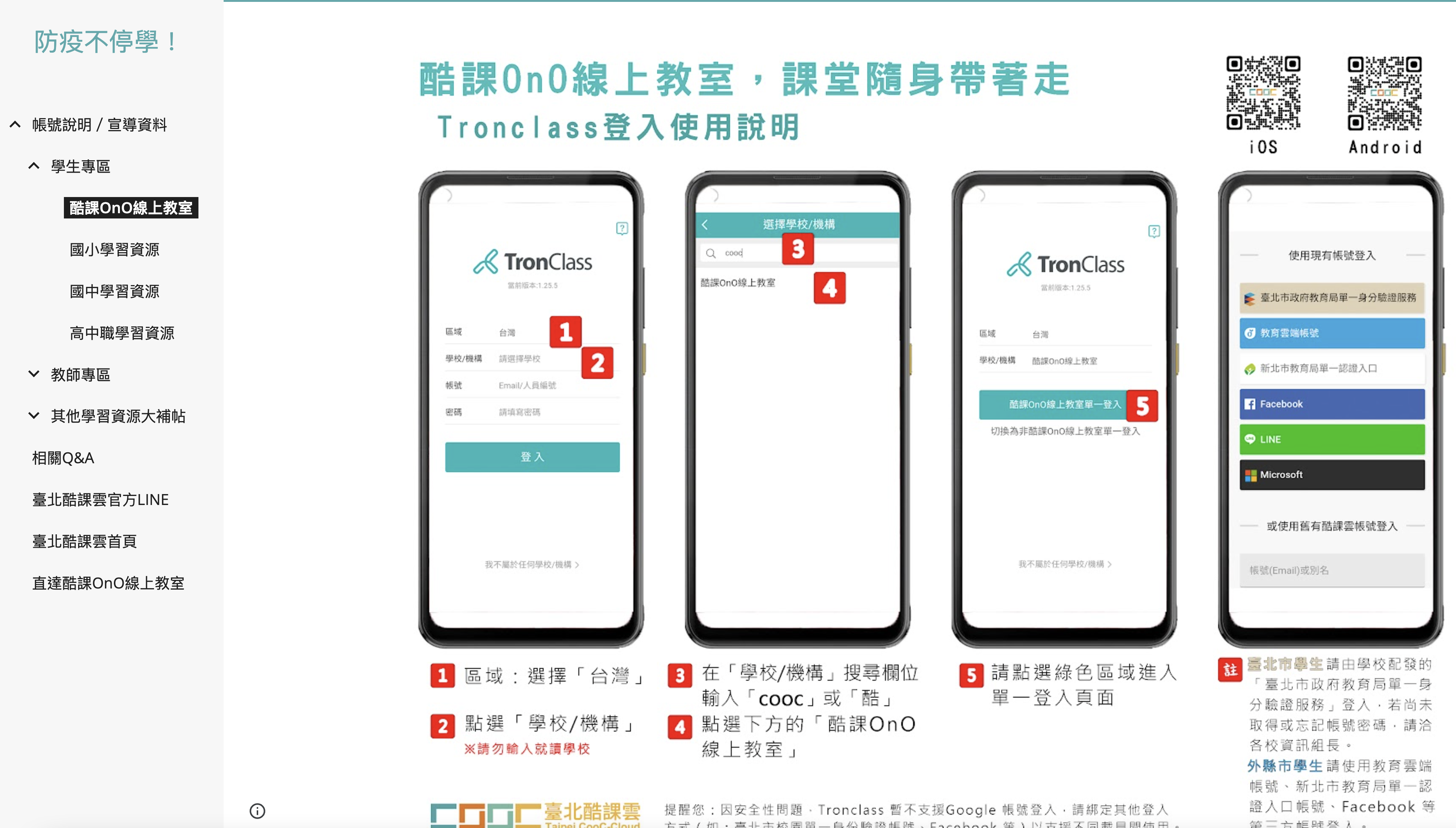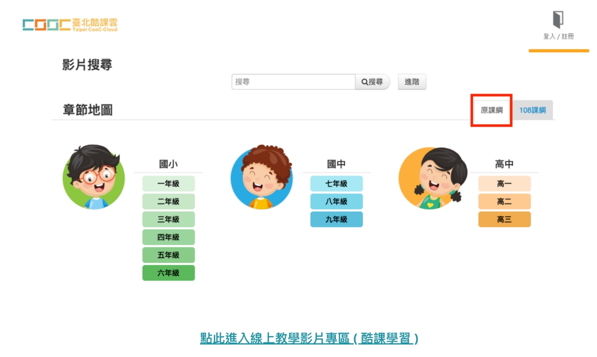 進入網站後,可以透過右上角先行註冊登入,不過在沒有註冊的情況下,我試了一下,應該只有酷課 OnO 線上教室不能用,國小~高中職資源區一樣是可以直接讀取的。