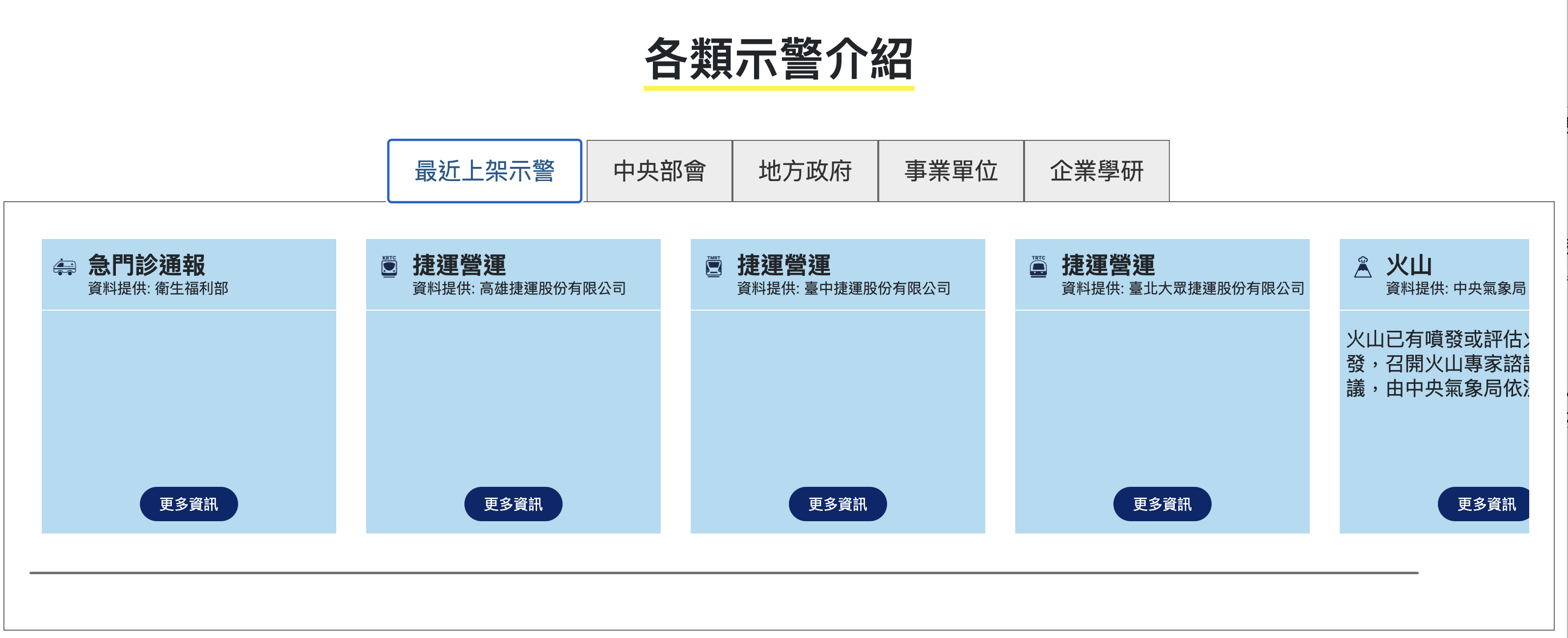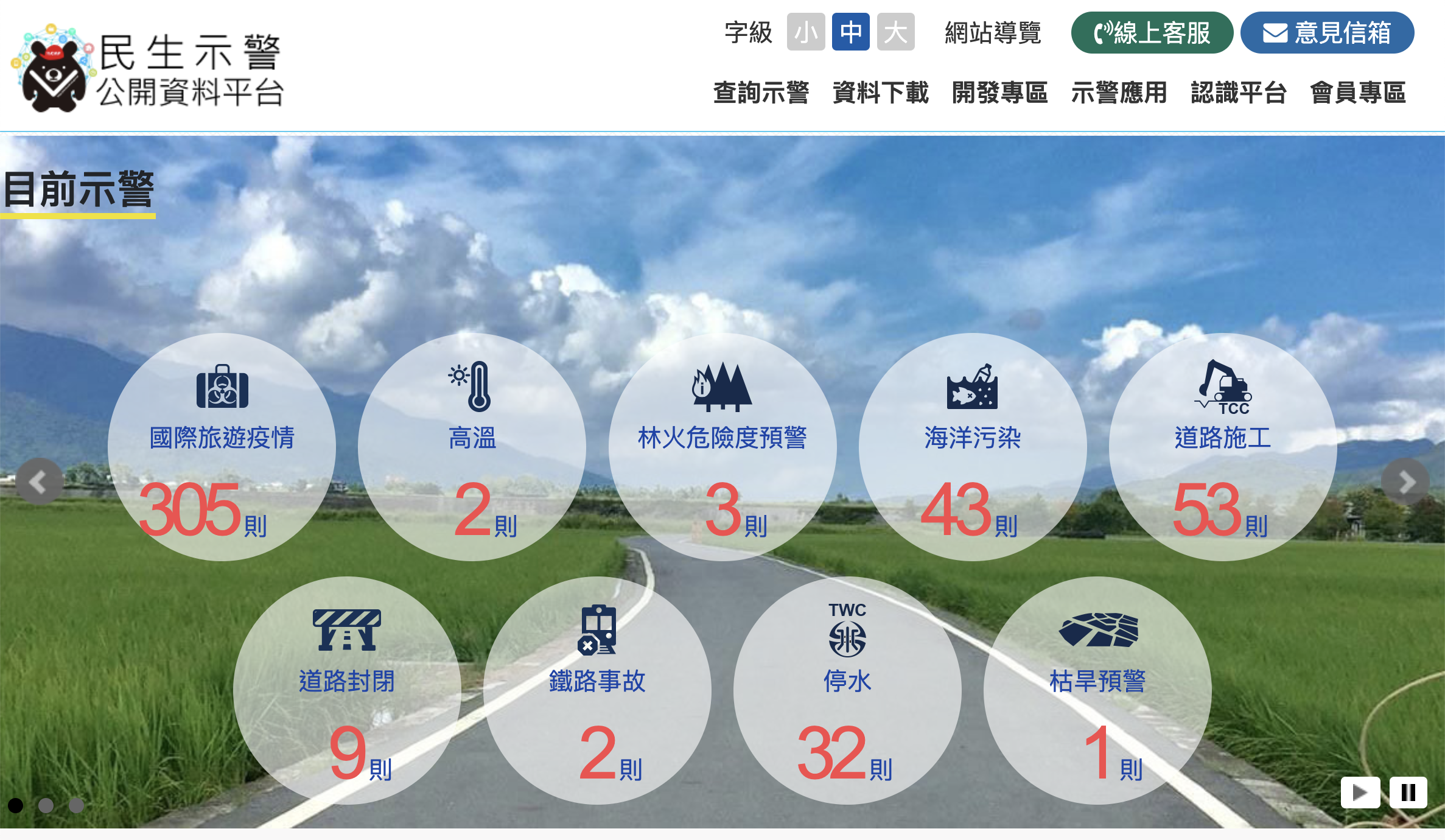 網站:https://alerts.ncdr.nat.gov.tw/indexHome.aspx進入網站後,在首頁就有各種示警資訊的類別可以選擇,,直接點擊就可以看各類別的相關示警資訊。