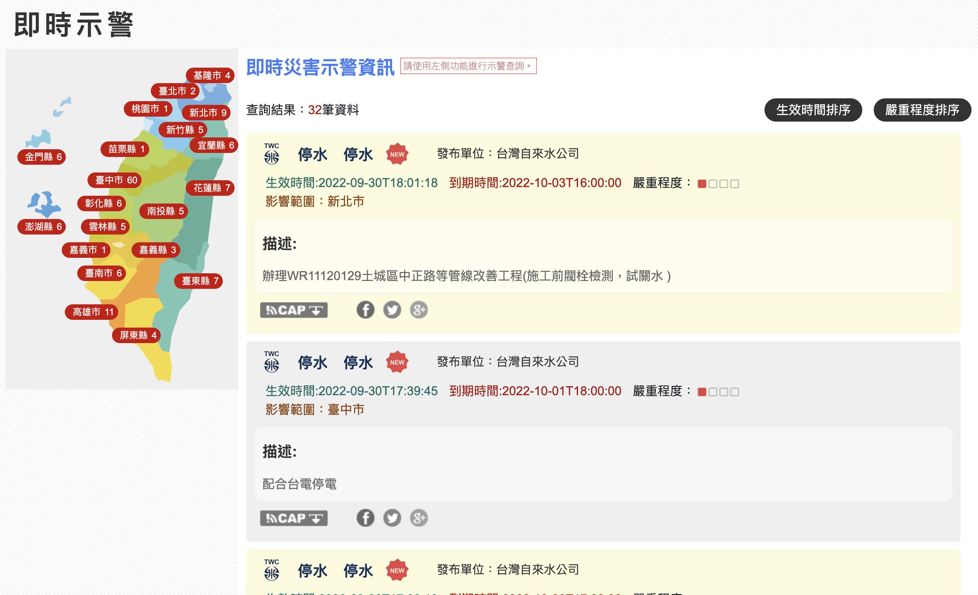 比如我點擊停水資訊進來,左邊還有縣市可以選擇查看,這樣可以更快找到與自己相關的示警資訊,原則上使用很簡單,我想應該不需要阿湯再一一介紹了吧。