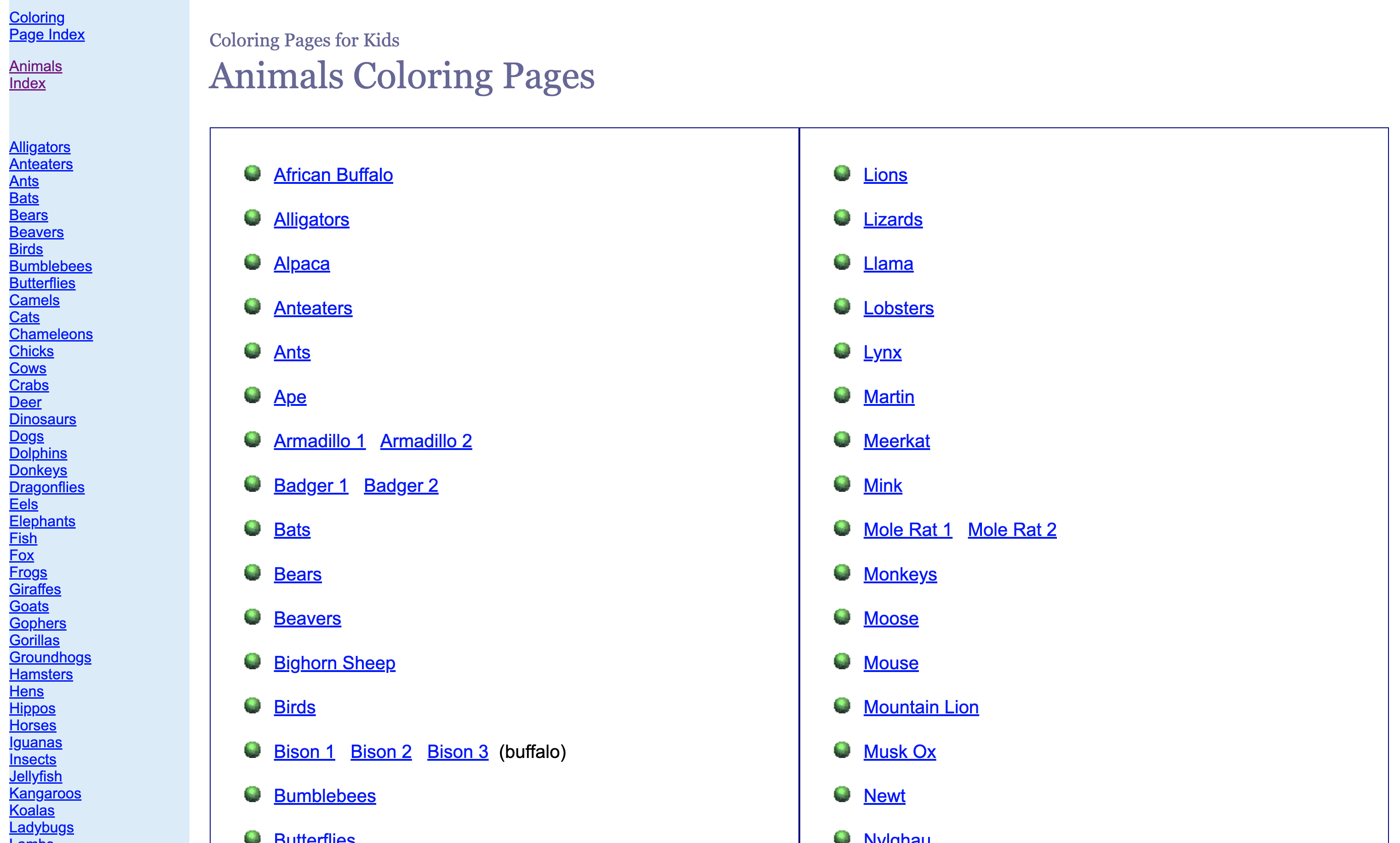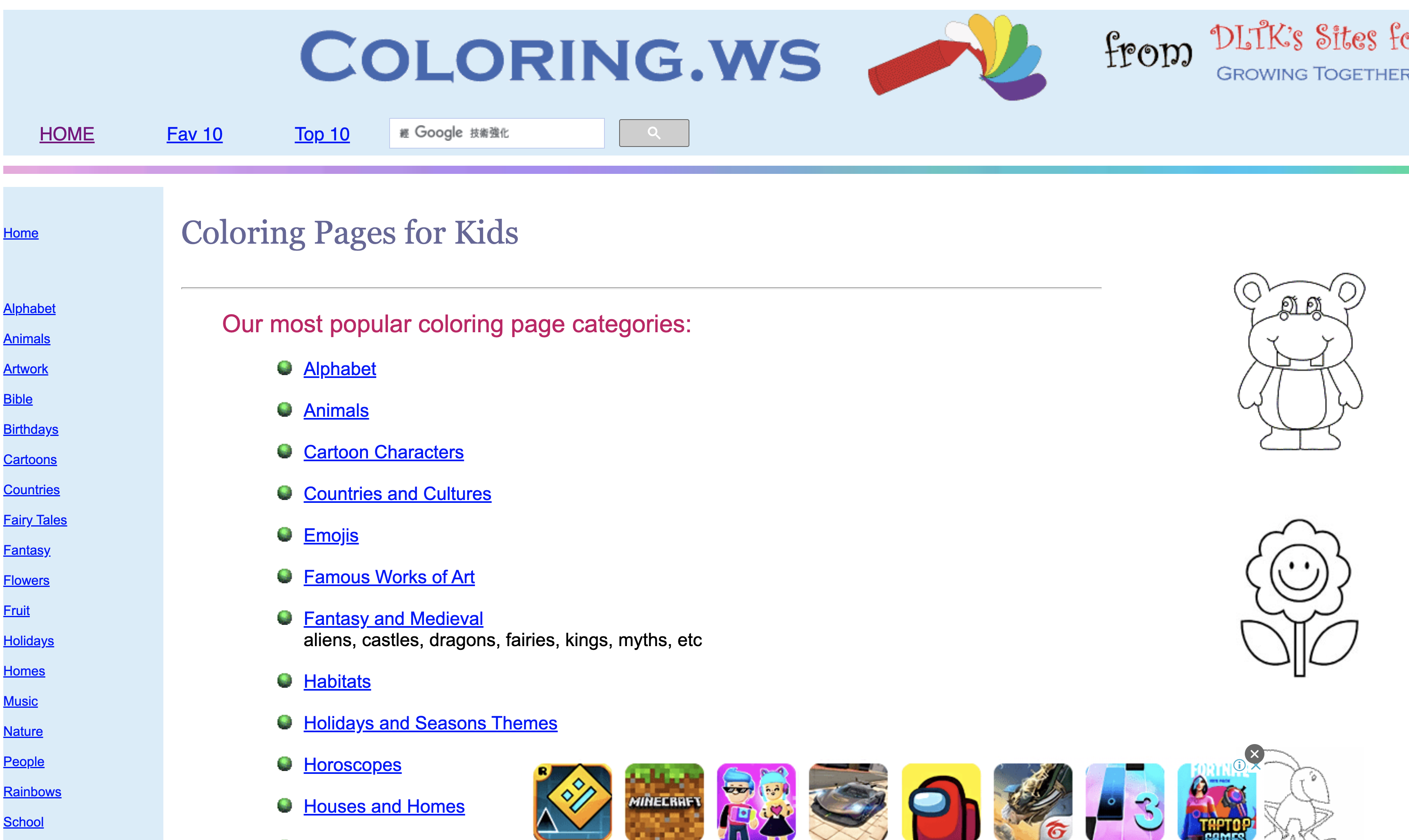網站:https://www.coloring.ws/進入網站後在左邊有格種類別可以選擇,每個類別裡都有超豐富的項目。