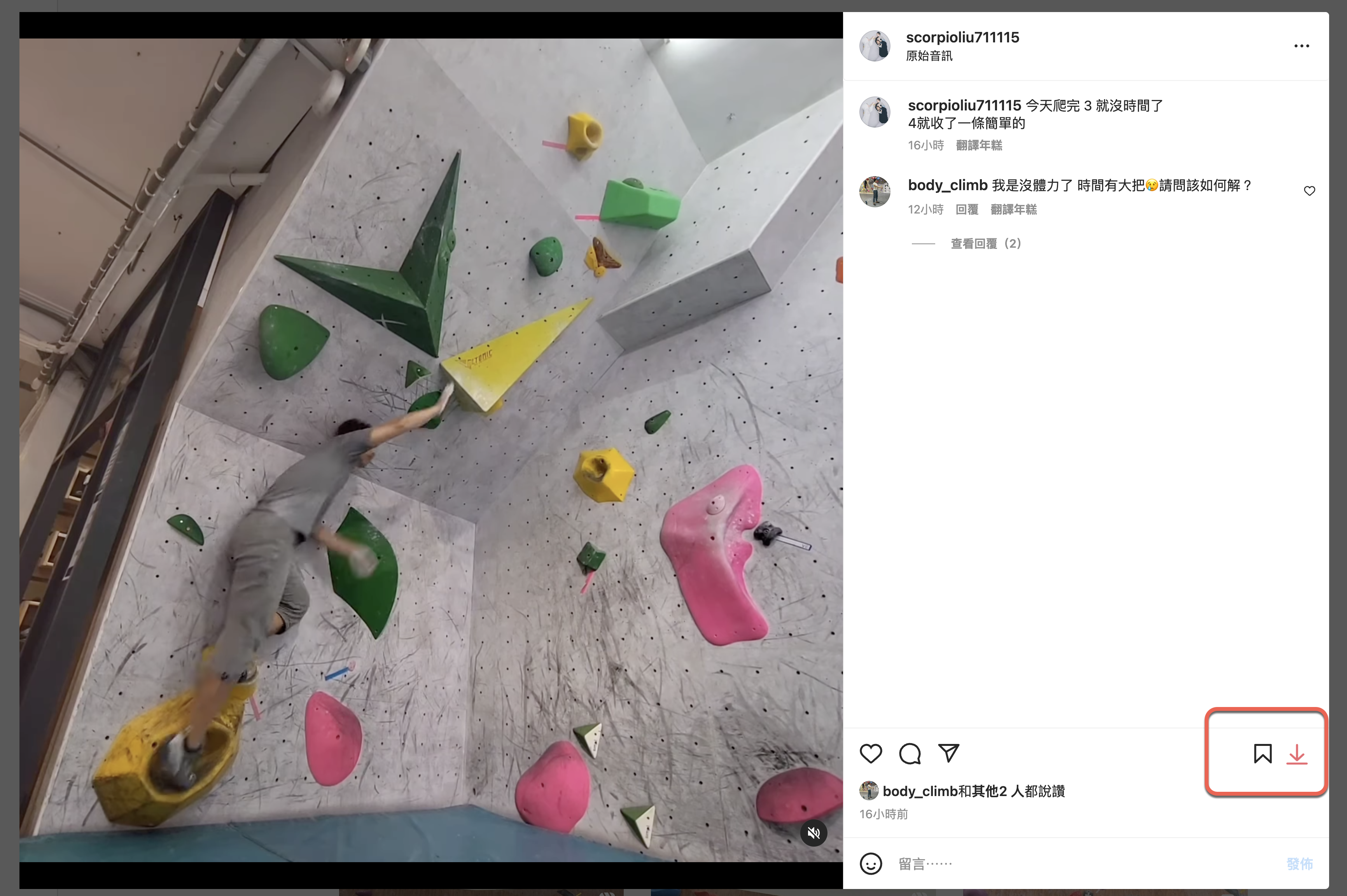 再重新整理 Instagram 頁面後,就可以在右下角原本收藏的按鈕旁,多了一個下載的按鈕,不論你是圖片或影片都能下載,目前僅不支援一次下載多圖或多影片,可能再等看看,或許很快就會開發了。