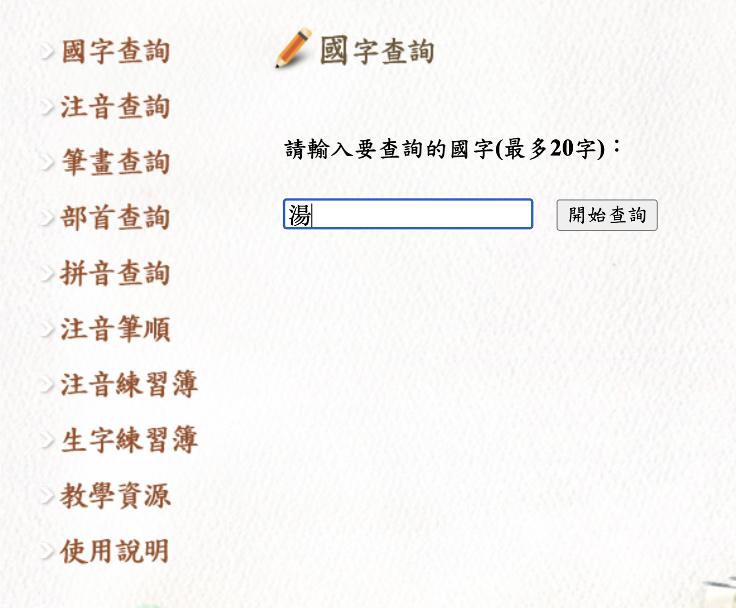 進來之後,左邊的選單就有完整的功能了,查詢的部份包括有國字、注音、筆畫、部首、拼音,以國字查詢為例,輸入湯,按下開始查詢。