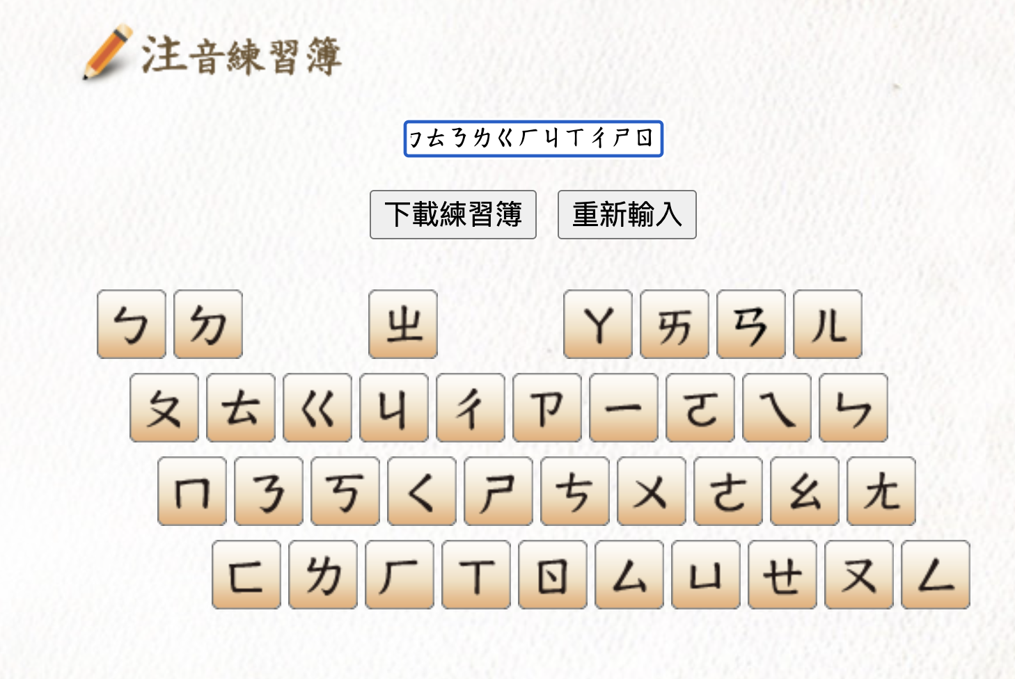 除了生字練習簿外,也有注音的練習簿,可以用來產生練習注音用的生字薄。