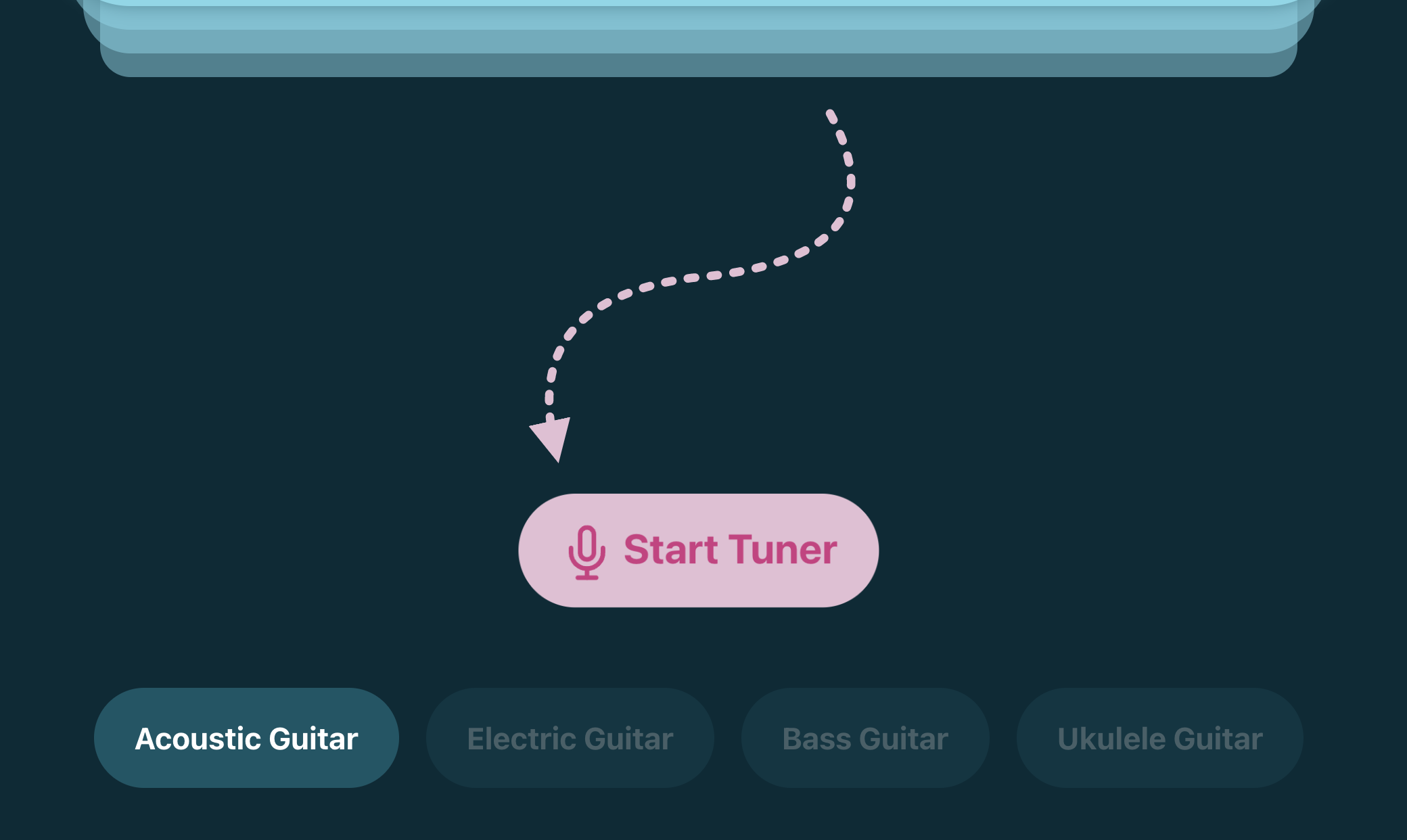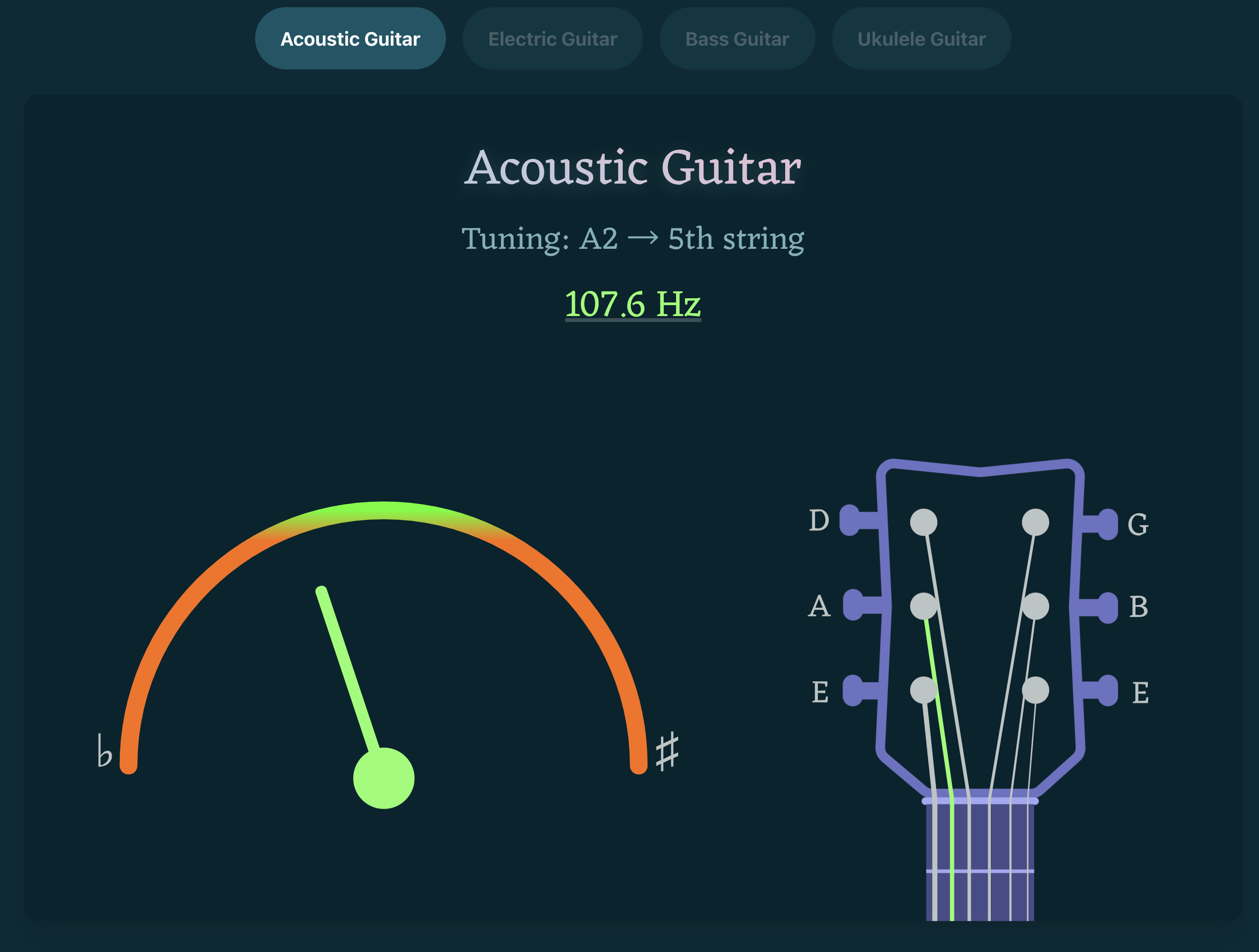 然後再往下拉一點就可以選擇你的吉他是哪一種,然後直接開始調音了,下方會即時顯示目前的音,阿湯手邊沒有吉他,不確定這準不準,大家可以試看看啊。
