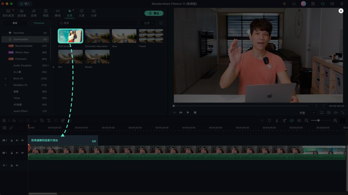 以濾鏡來說,選擇效果後,在左側就有很多內建的效果,依照想要使用的點擊後就會下載,然後就可以套用了,只要拉到下方影片時間輯後再拖曳套用範圍即可,沒有任何難度。