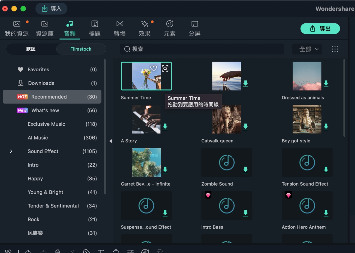 音樂與音效內建的部份,阿湯也試聽了一些,不論用在一般影片、旅遊或是專業介紹,都有相對應的背景音樂、音效可以套用,不得不說,內建提供的東西真的很多,幾乎不用額外再找其它素材。