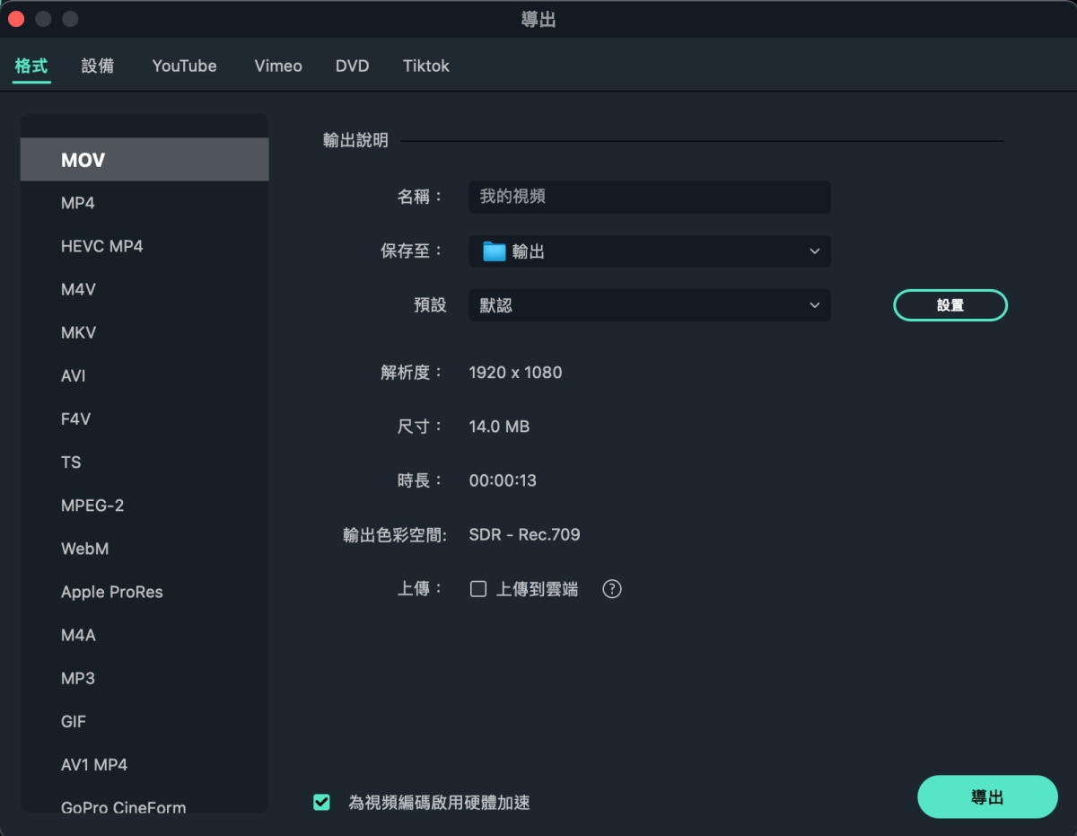 輸出的格式有非常多選擇,常用的 MOV、MP4 都是有支援的,解析度則是依照原素材的最高解析度做為預設輸出值。