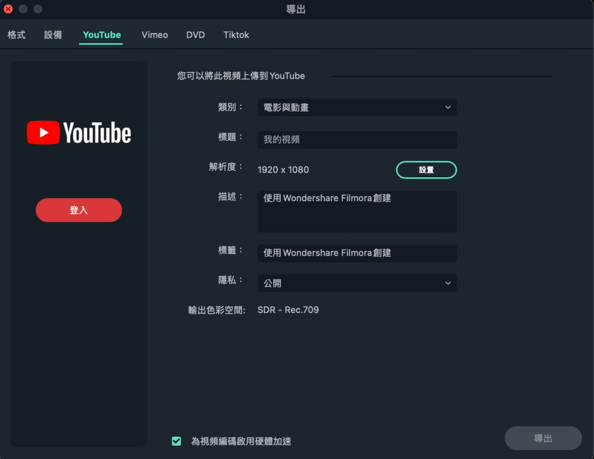 輸出也能直接設定好 YouTube 帳號,直接就在 Filmora 裡輸出上傳到 YouTube 頻道,包括標題、描述及標籤都能在這裡設定,這麼一來,輸出後就可以直接在 YouTube 上再做點簡單的編輯就可以上架了。