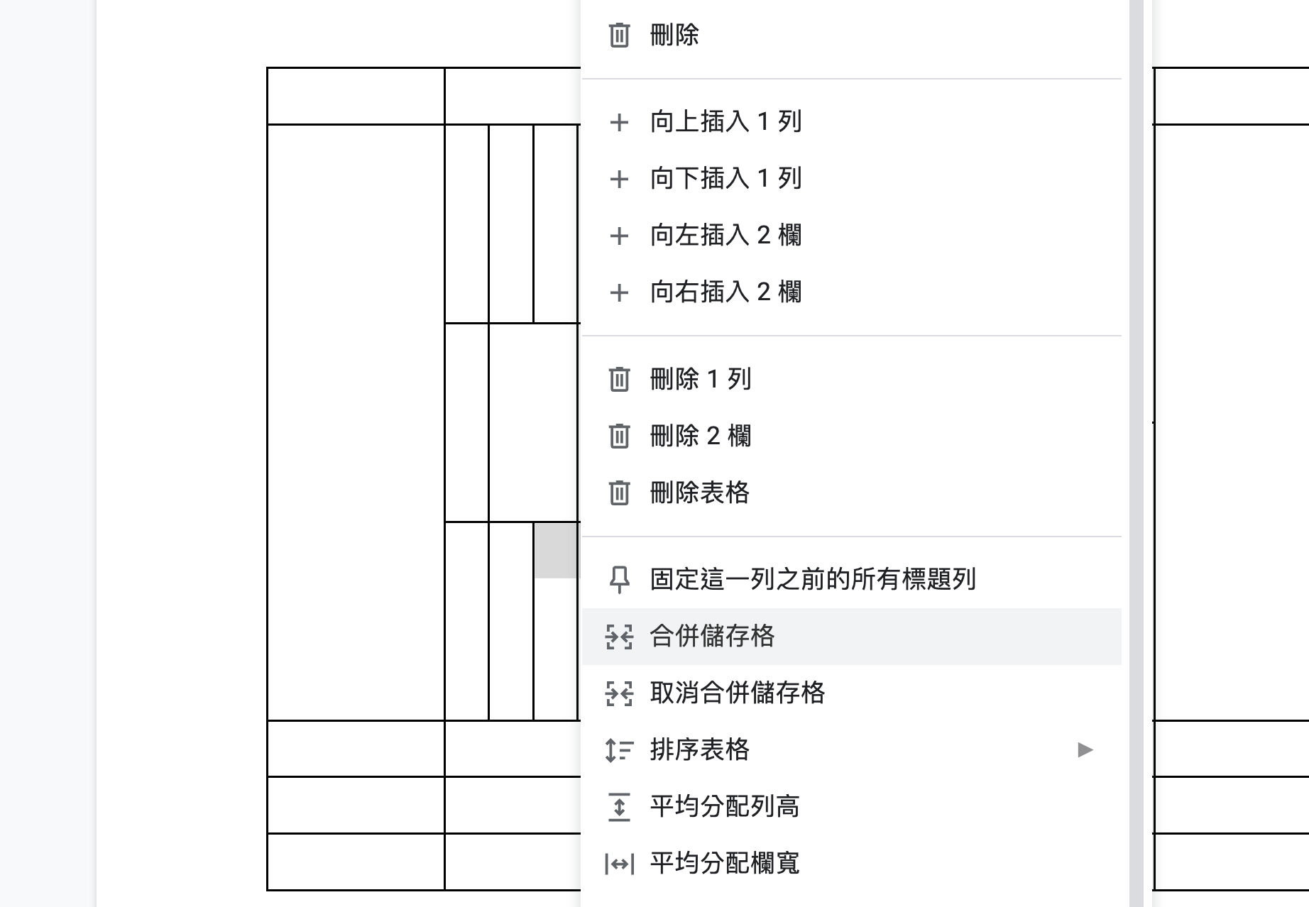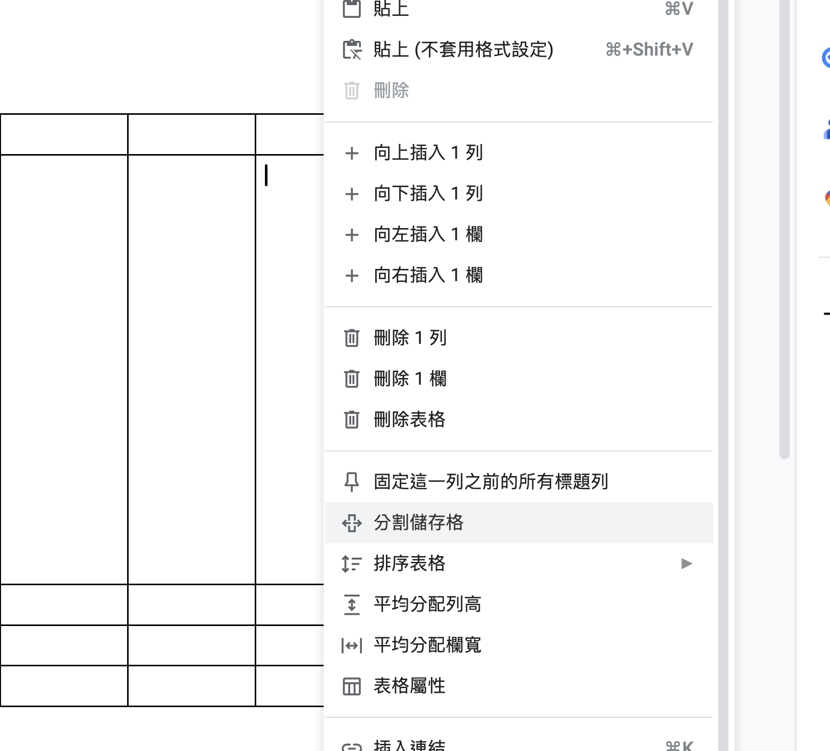 這時我們可以在任一個想要分割表格的內容右鍵,然後選擇「分割儲存格」。