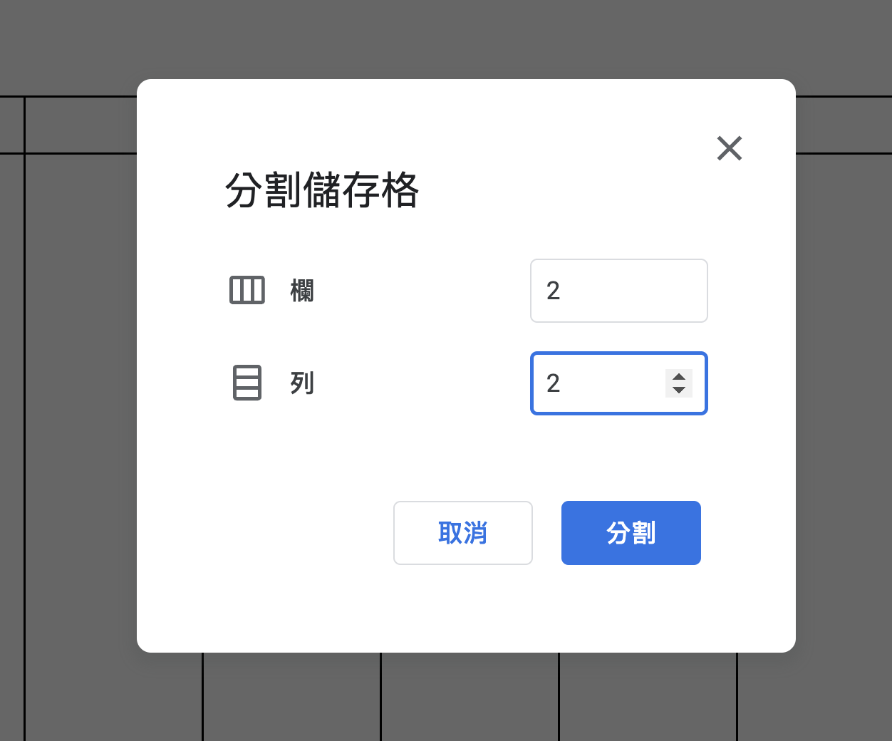 這時可以直接選擇儲存格怎麼分,假設是要將一格再切成四格,直接選 2 跟 2 。