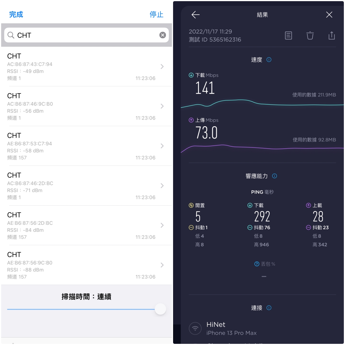 - 速度測試:下載 141Mbps、上傳 73Mbps