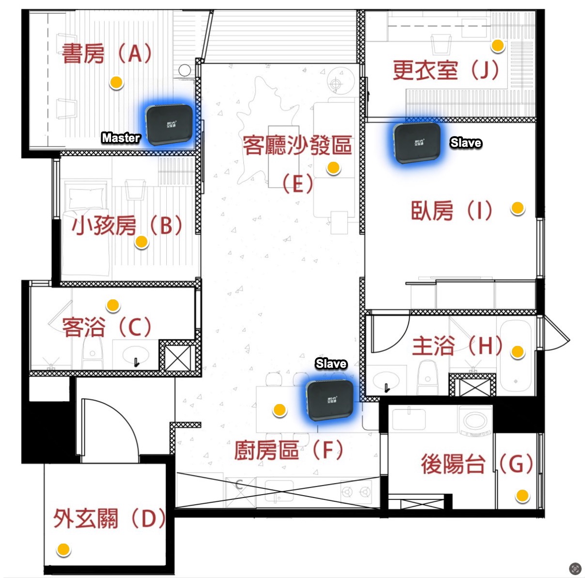 至於測試,我們就直接將家中切分成九個點來測試,其中書房(A)就是第一主機所在的位置,如果只用一台 Wi-Fi 路由器放在書房的話,光是到主浴(H)就衰減掉 80~90% 左右的訊號,而到了陽台(G)點,更是斷斷續續,那麼透過中華電信全屋通的 Mesh Wi-Fi 搭建後,訊號會如何呢?下圖也標記了三台全屋通設備的放置位置,我們往下針對每個點逐一的來查看信號強度及速度測試吧。