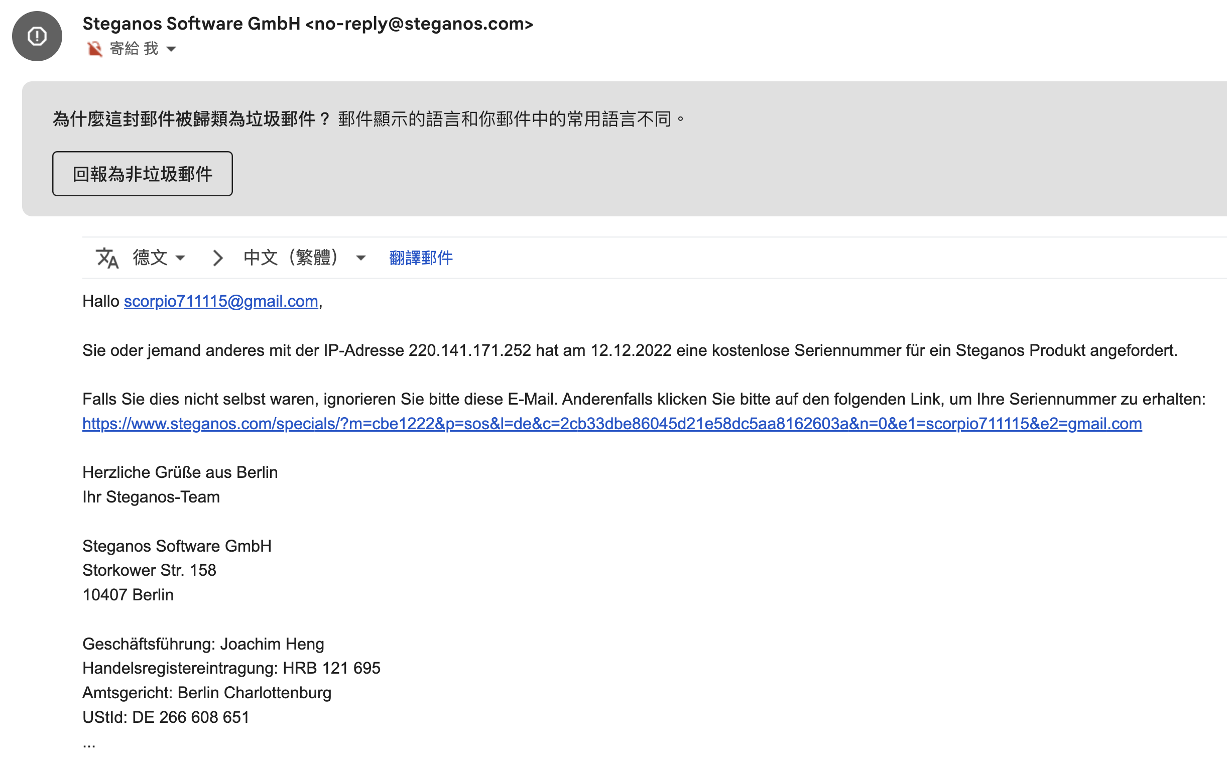 不確定這活動還有多久,總之,進入頁面後,這語言看不懂沒關係,就是填寫你的 Email 之後,按送出,再去收驗證信。