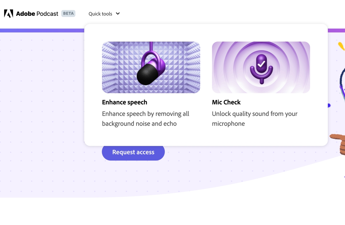 進入站後,點擊左上角的「Quick tools」,下拉就會有二個工具可以使用,一個是 Enhance speech(聲音強化),另一個為 Mic Check(麥克風檢查),我們先來看看聲音強化的部份。