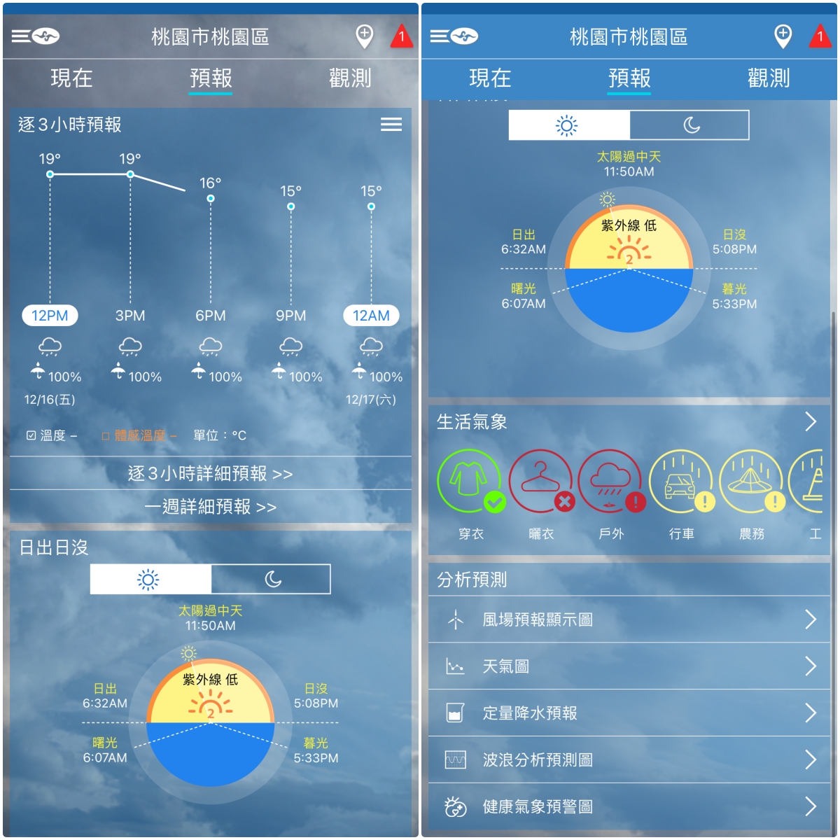 而觀測裡面,就有更詳細的天氣資訊,包括濕度/雨量/氣壓/風力風向/能見度/衛星雲圖/雷達回波等,不用上中央氣象局網站全部都在 App 裡就能查看。