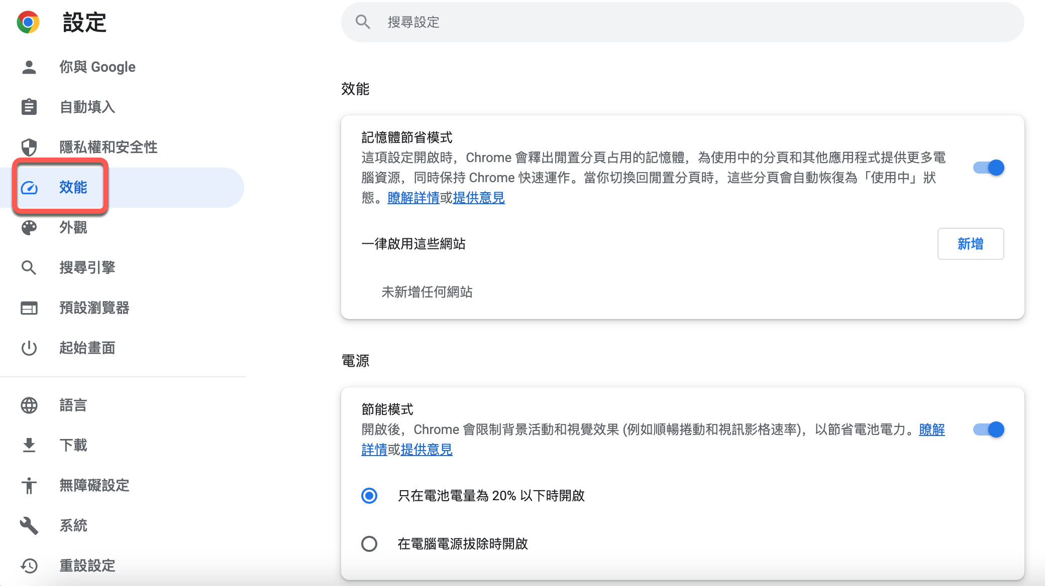 當你將記憶體節省模式跟電源效能模式打開任一項功能後,就可以在 Google Chrome 設定「chrome://settings/performance」中,看到多了一個「效能」的頁面,裡面就會有二種模式,記憶體節省模式,想要使用的話就將他打開就好,也可以針對網站各別設定使用。