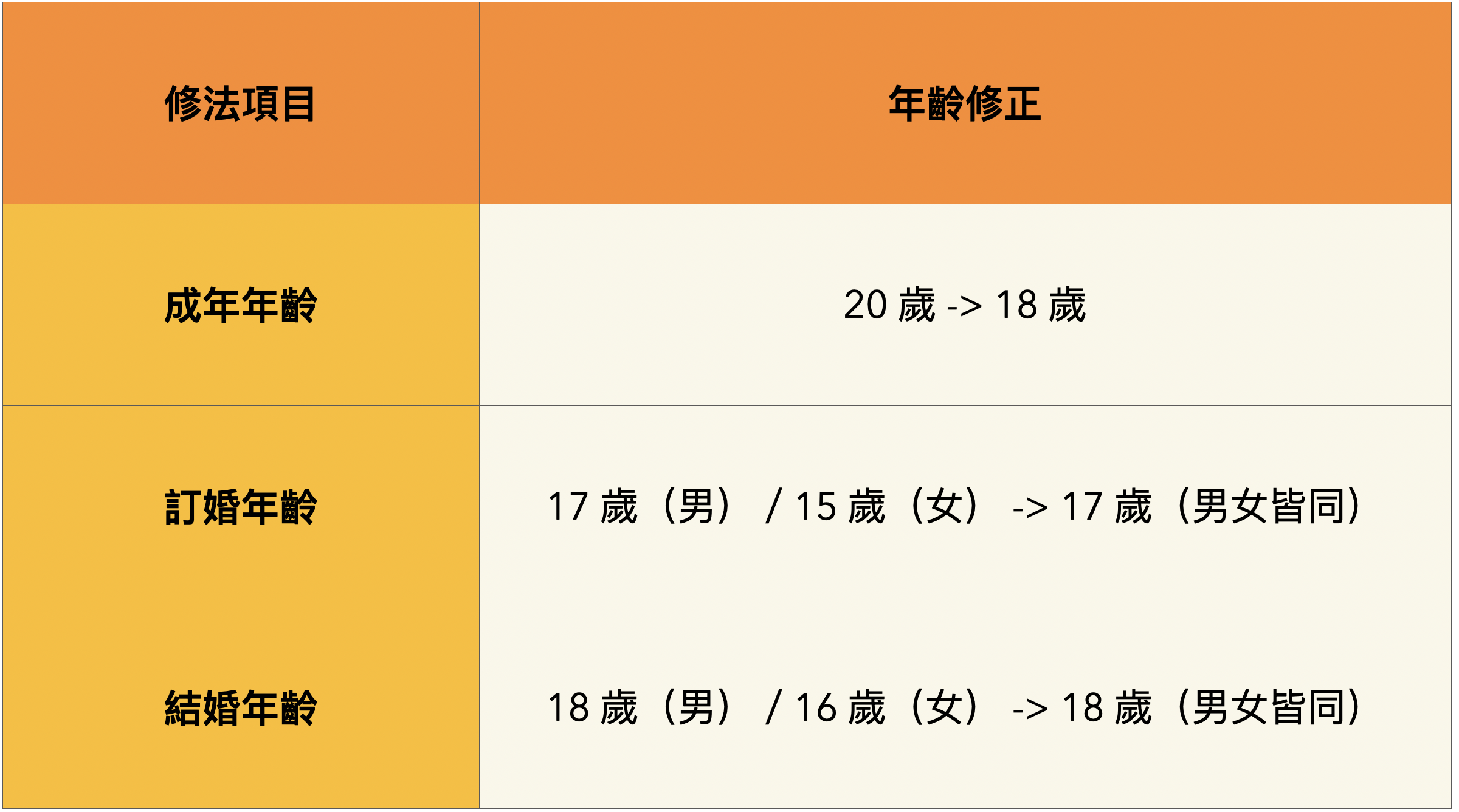 結婚的部份大家可以稍微注意一下,原本由於成年法定年齡為 20 歲,即便是符合結婚年齡,仍然需法定代理人同意,但是現在成年法定年齡下修為 18 歲,意即只要男女雙方都滿 18 歲,就可以手牽手一起去戶政登記結婚了,不需要有法定代理人這一關了。