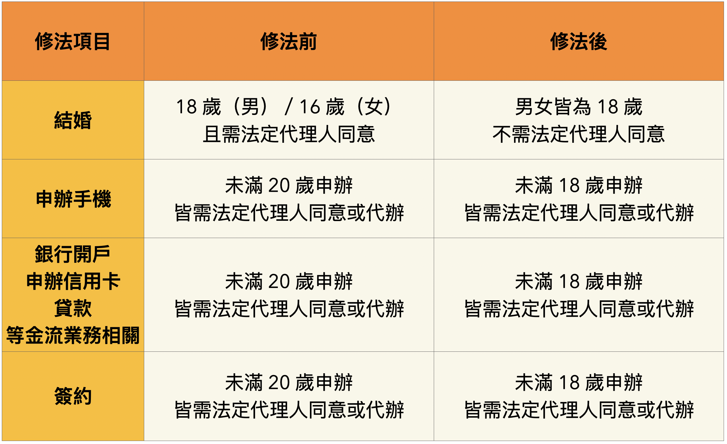 而這邊提到「簽約」只要滿 18 歲就可以自主決定,光是這個差異就很多,因為像是申辦手機、銀行金流業務等,都是屬於「簽約行為」,所以光是可以自主簽約,就多了很多事的自主權,包括還有像是成為公司負責人、董事等要職,或是像發起集會遊行、擔人工商團體會員,購買商品分期付款等,這些都變成只要滿 18 歲即可為之。