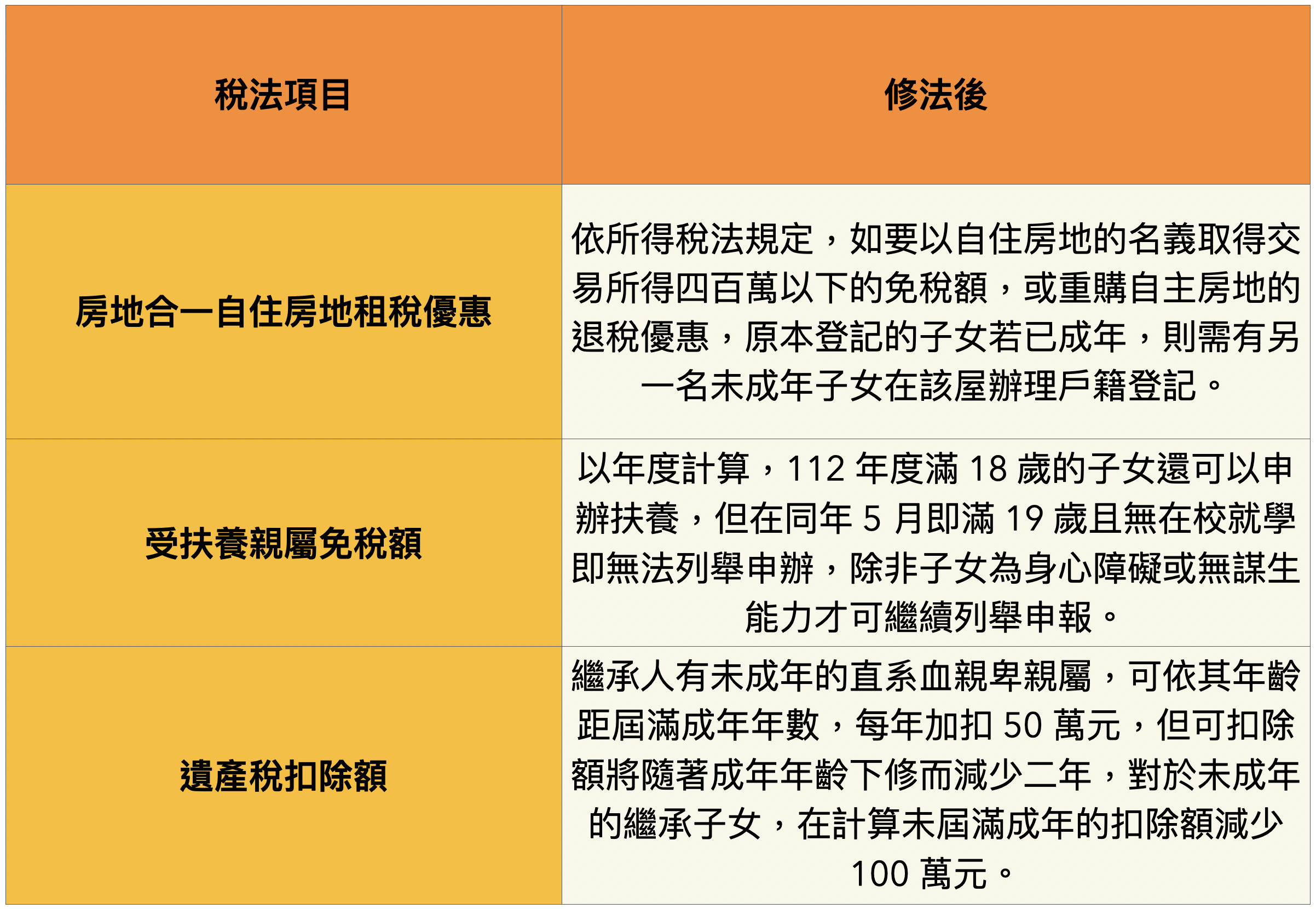 民法下修成年法定年齡後,最具影響的三大稅法如下圖,分別有房地合一自住房地租稅優惠,綜合所得稅中的扶養列舉以及遺產稅,其中受影響最大的,我覺得主要有二個部份,一個是自住房地租稅,很多投資客都會利用未成年子女來獲取退稅優惠,現在下修年齡後,能利用(?)的時間就少了二年。