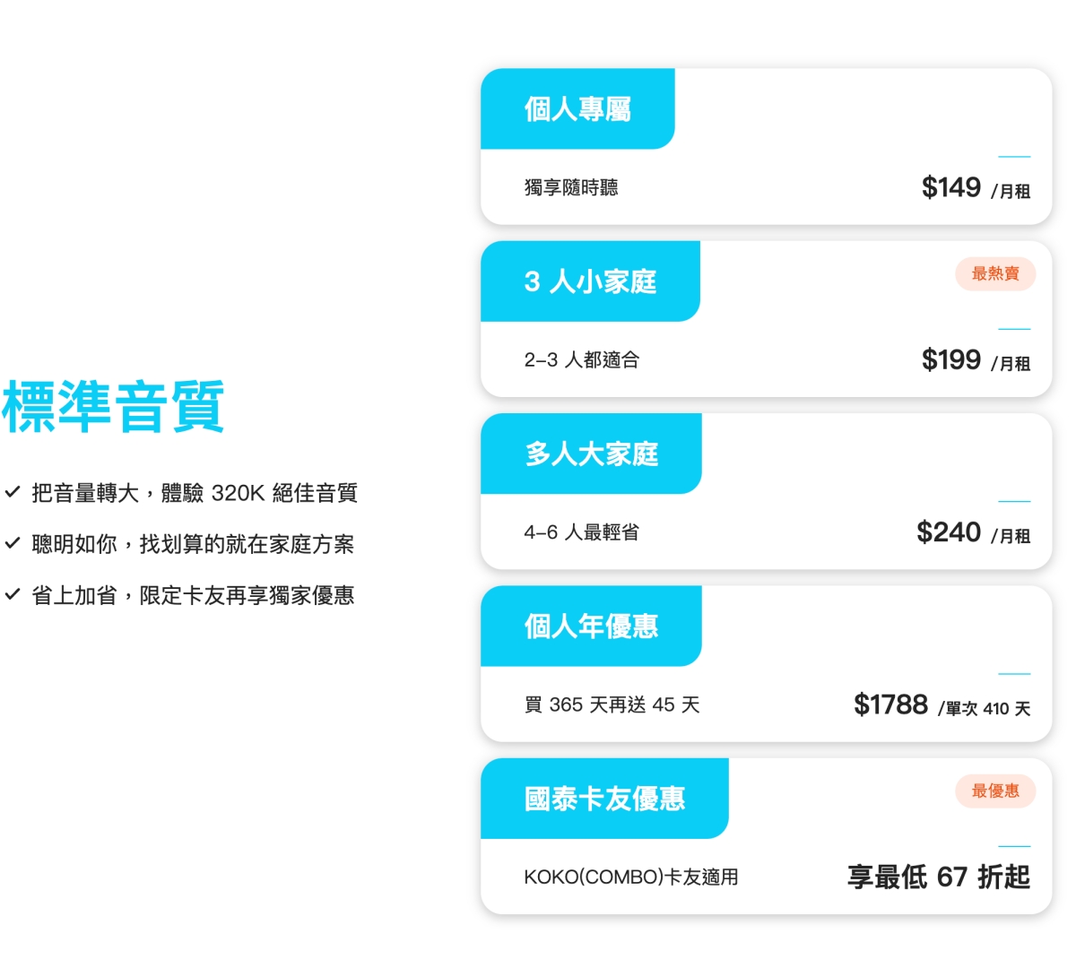 費用的部份,定價跟 Spotify 有點類似,除了個人 149 NTD/月,家庭方案有 3 人方案 199 NTD/月,還有 6 人家庭方案 240 NTD/月,另外還有個人年費優惠,以及信用卡優惠等,我想這也是因為是台灣的公司才能有的不同方案,國際公司比較少能這樣在地化定制方案。