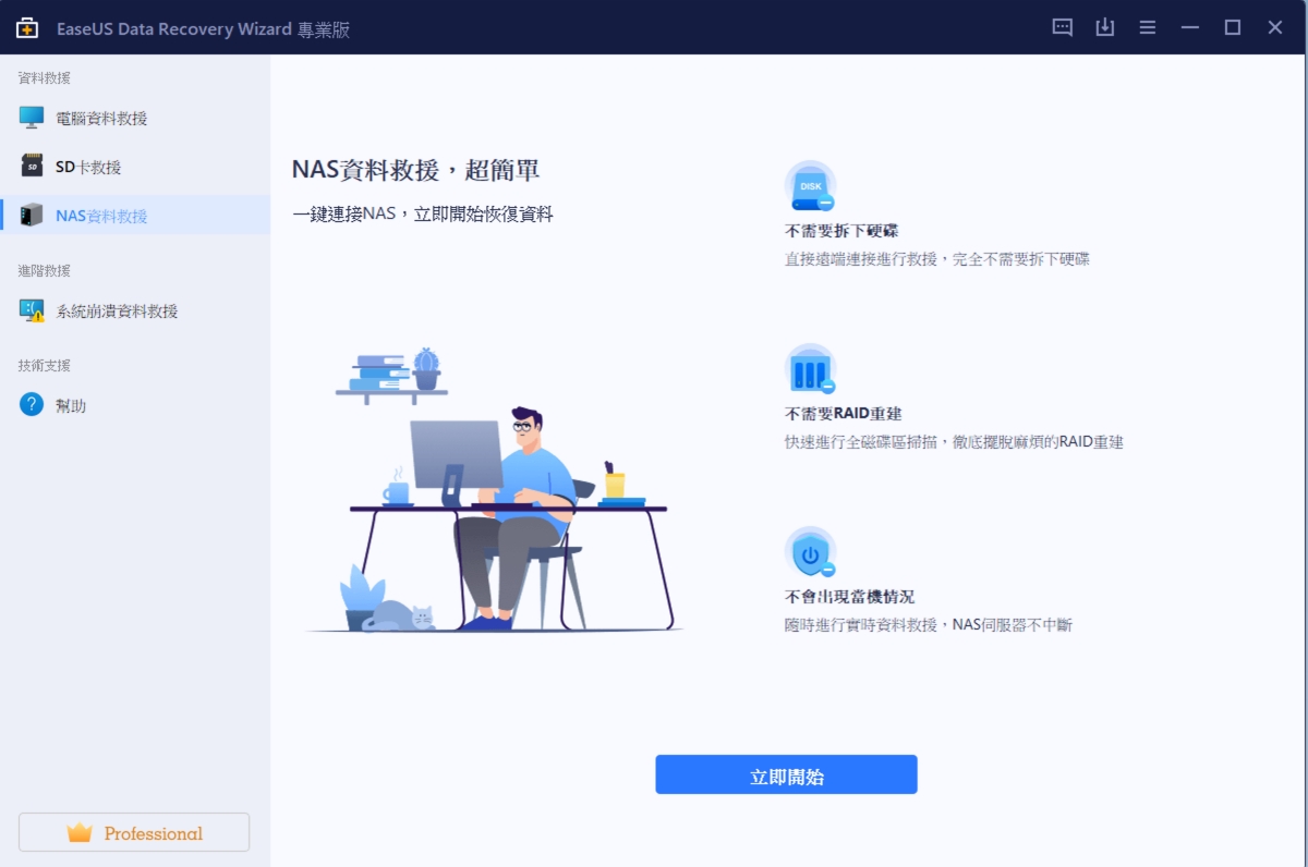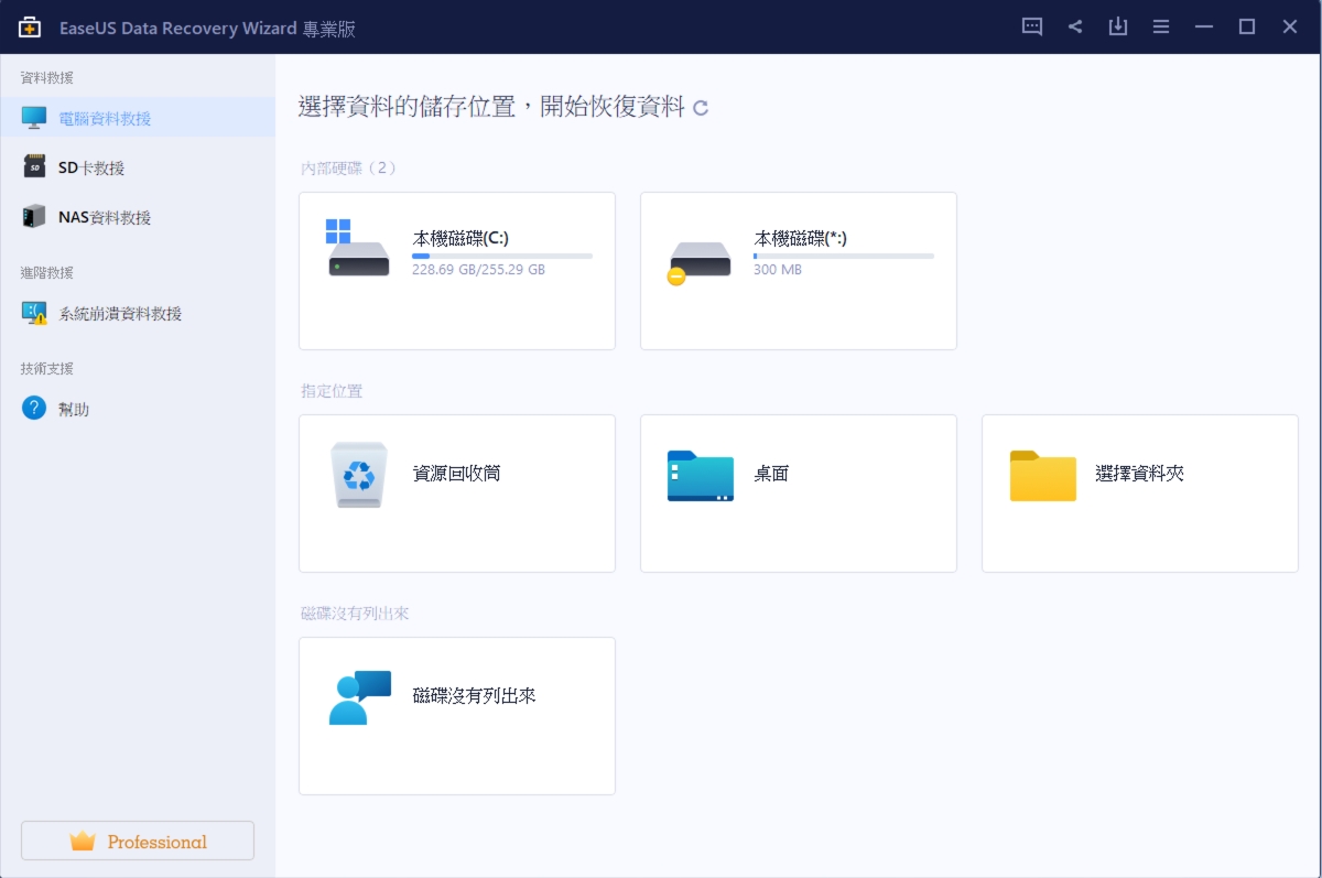 進入軟體後,介面操作非常簡單易懂,左邊已經幫你做分類,包括電腦資料救援、SD 卡救援以及 NAS 資料救援,這也是阿湯首次在資料救援軟體中看到 NAS 資料救援,一般都是只有