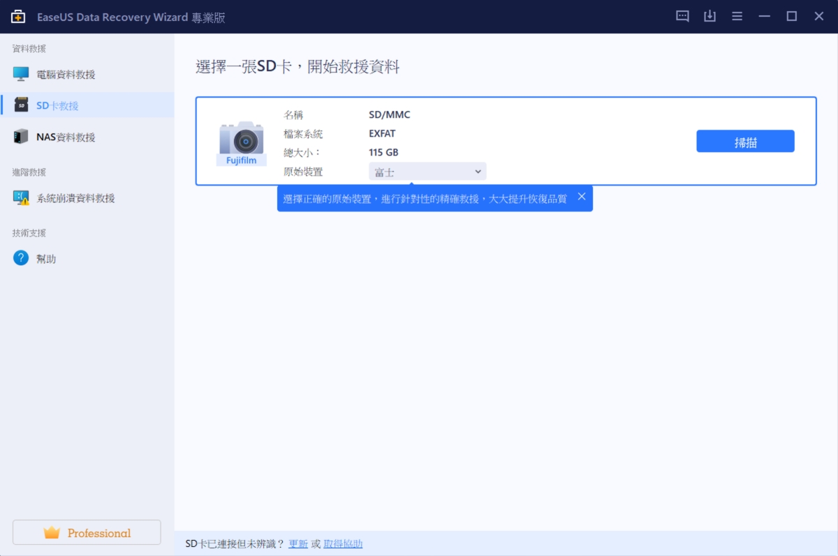 再來我們來試看看,現在我覺得最常用到的記憶卡資料救援,各種 SD 記憶卡、隨身碟、行動硬碟都可以,我這邊就以我的相機記憶卡來測試看看,究竟能夠掃描到多少東西。
