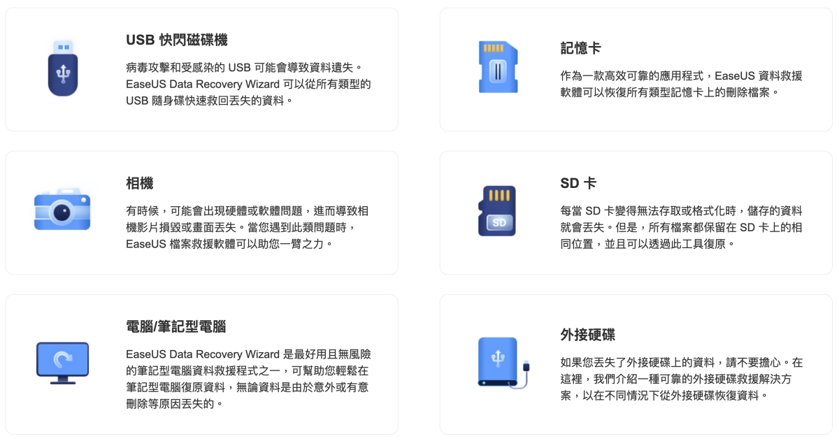 EaseUS Data Recovery Wizard 可以救援的裝置很多,包括 USB 隨身碟、行動硬碟、各種記憶卡、相機資料、電腦,又或像 NAS 也支援。