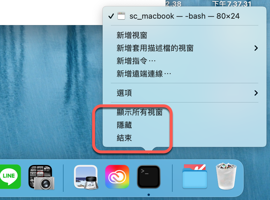 首先我們可以在要關閉的應用程式圖示上右鍵,這裡原本看到的只有隱藏跟結束,我們往下來看。