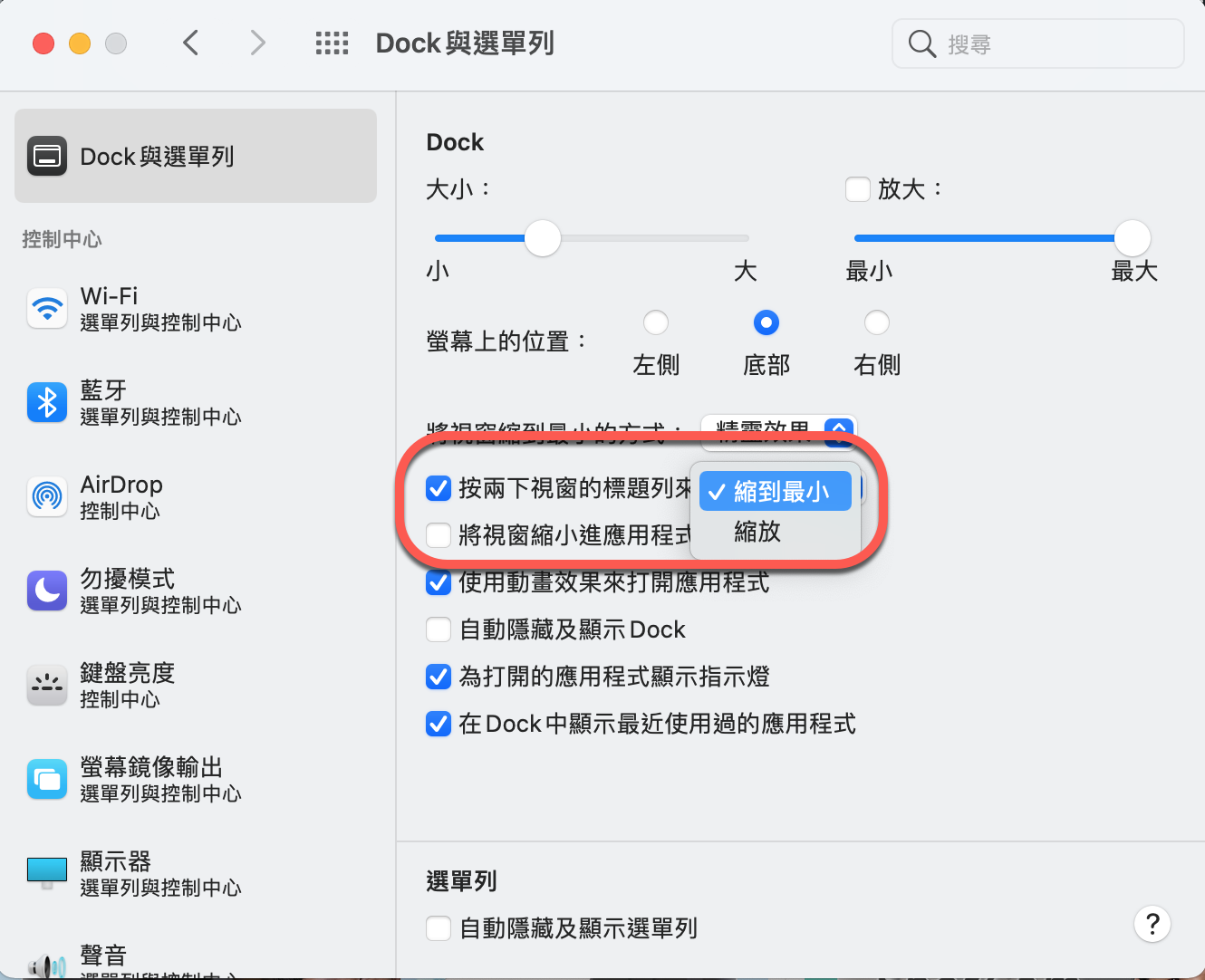 將原本「按兩下視窗標題列來」的「縮放」改為「縮到最小」,因為縮放的作用真的不大...