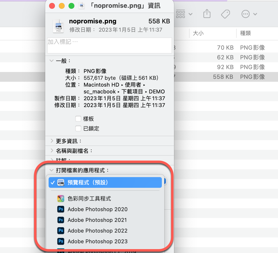 在該格式的任一檔案右鍵進入「取得資訊」,然後展開「打開檔案的應用程式」。