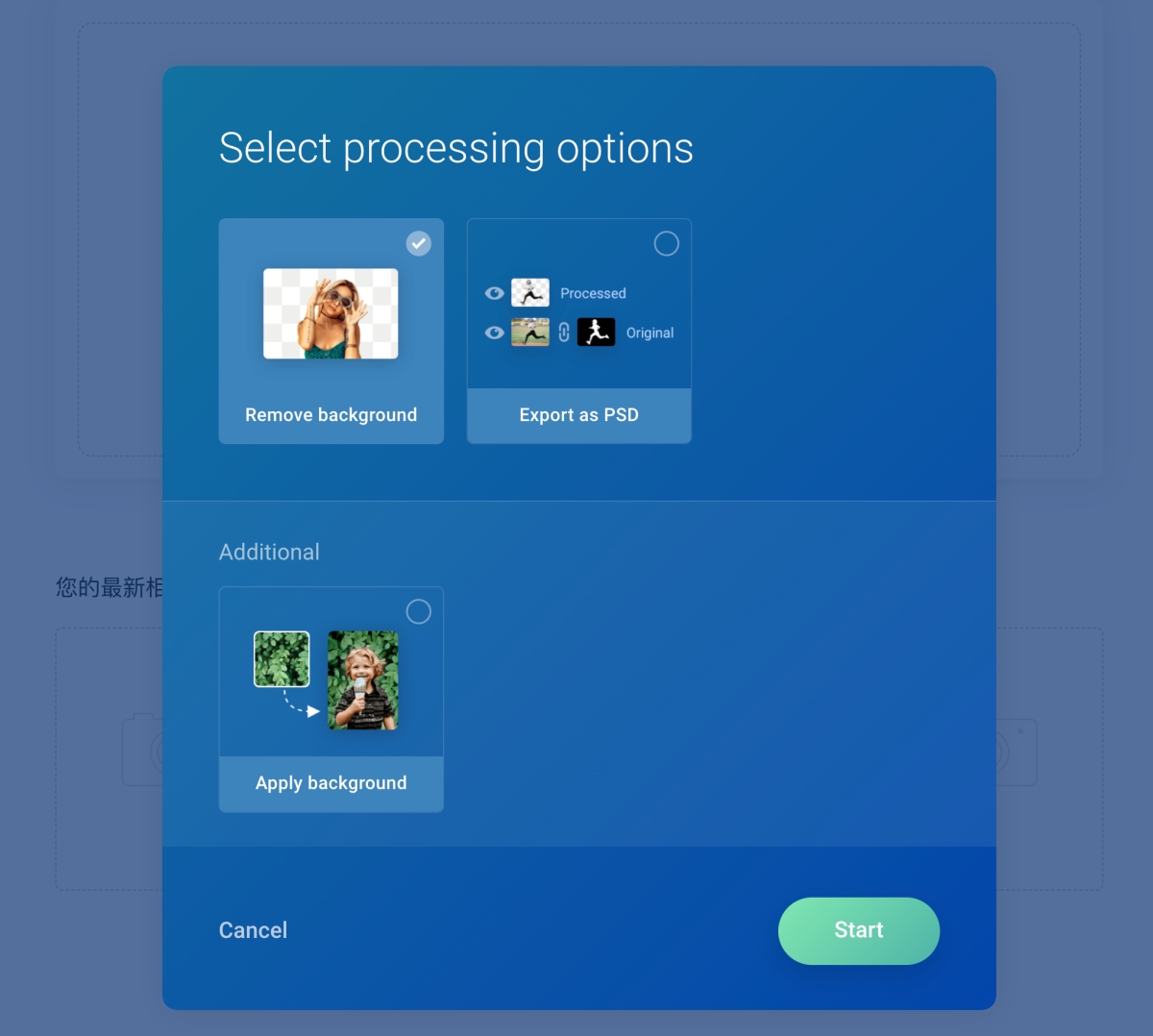 上傳後就可以選擇要去背的方式,單純去背呢,還是需要可以輸出為 PSD 檔案,又或是下方有額外的替換背景的選擇。