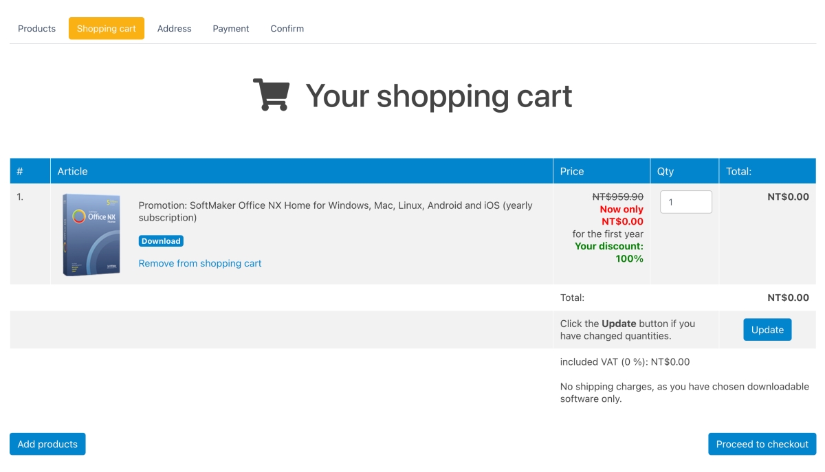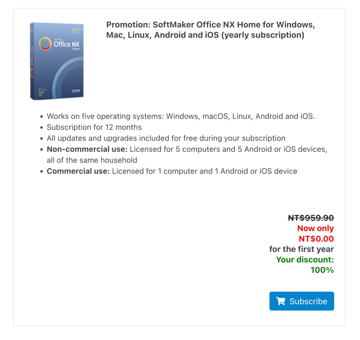 接下來往下拉到底就可以看到 Office NX Home 這個軟體,原價 NT959,變成了 0 元,點擊 Subscription 繼續吧,這過程是不會要求你輸入信用卡的,用力的往下吧。