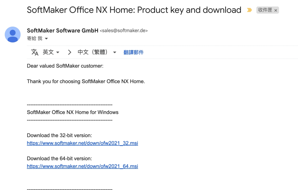 完成後,就會收到一封信件,裡面包括了各系統版本的下載連結,最下方也提供了產品序號,第一次啟動會需要用到。