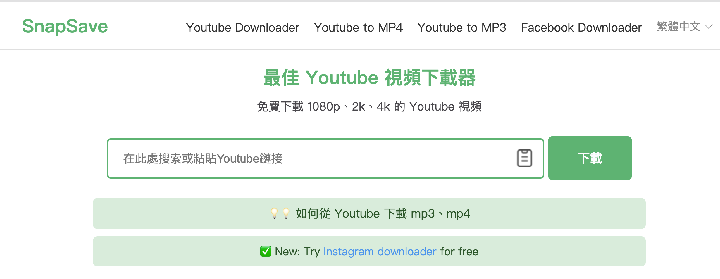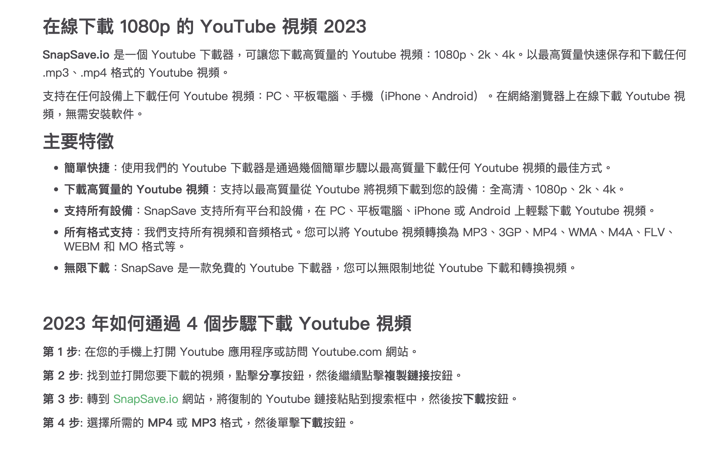 YouTube 的下載工具,應該不用我多說,有用過的大概都知道,一般都只能下載到 720p 解析度的影片,沒別的原因,因為 YouTube 一般有影有聲的原始檔案,最高只到 720p,再往上的話,影片跟聲音都是分開的,所以大部份的網站是不會想要負擔轉檔,因此很少可以看到線上工具能下載到 1080p 且有影有聲的檔案,今天要分享的 SnapSave 號稱能下載最高 4K 的影片,但實測後最高只有 1080p,我試了很久都沒有 4K 的可以下載,不過 1080p 還是很實用,有需要的就用看看吧。