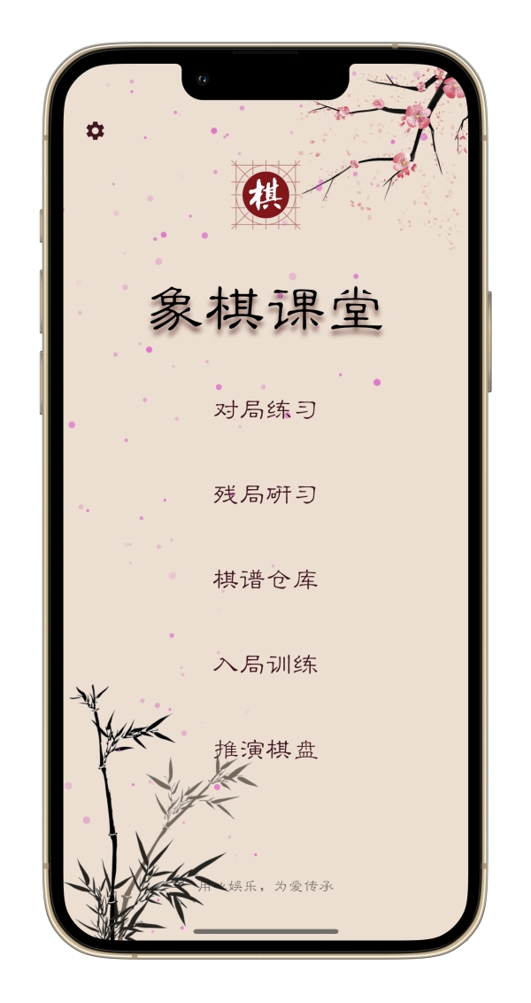 進入後,有幾個功能,分別是對戰(和電腦、別人都可以)、殘局解題、棋譜、入局訓練及沙盤推演功能。