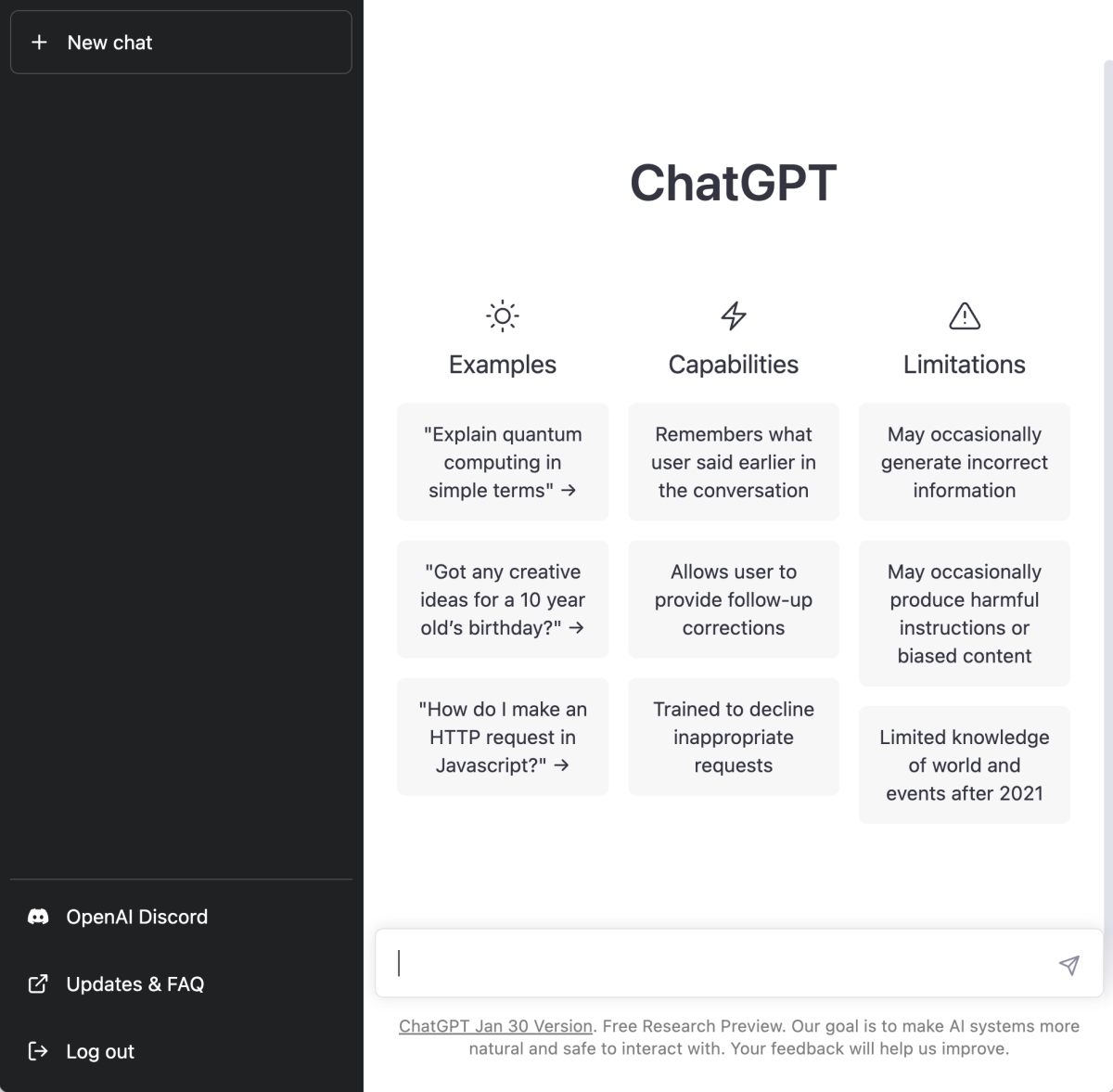 註冊成功後就可以進入來和 ChatGPT 聊天,前面是告訴你一些提醒,ChatGPT 會收集所有的問答內容,基本上就是靠大家來進化的。
