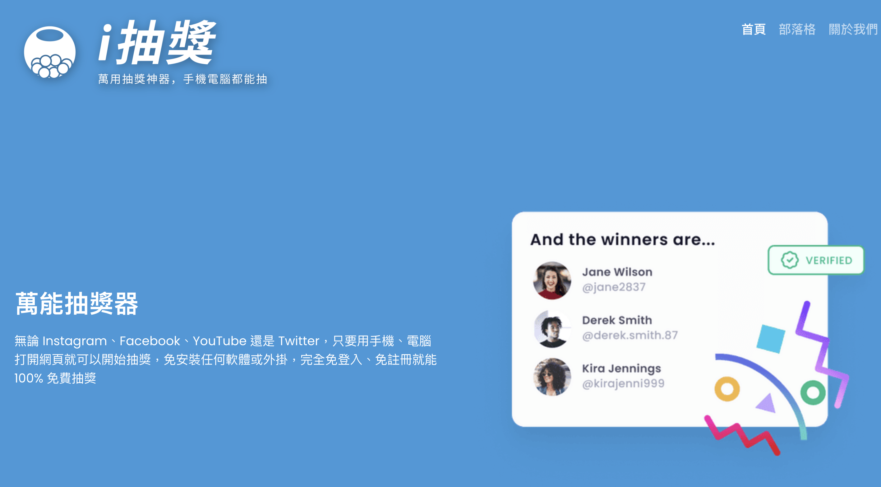 在 i 抽獎頁面往下拉,就有 Facebook、Instagram、YouTube、Twitter 不同的抽獎器可以使用,但其實從他們的部落格進去,還有介紹到