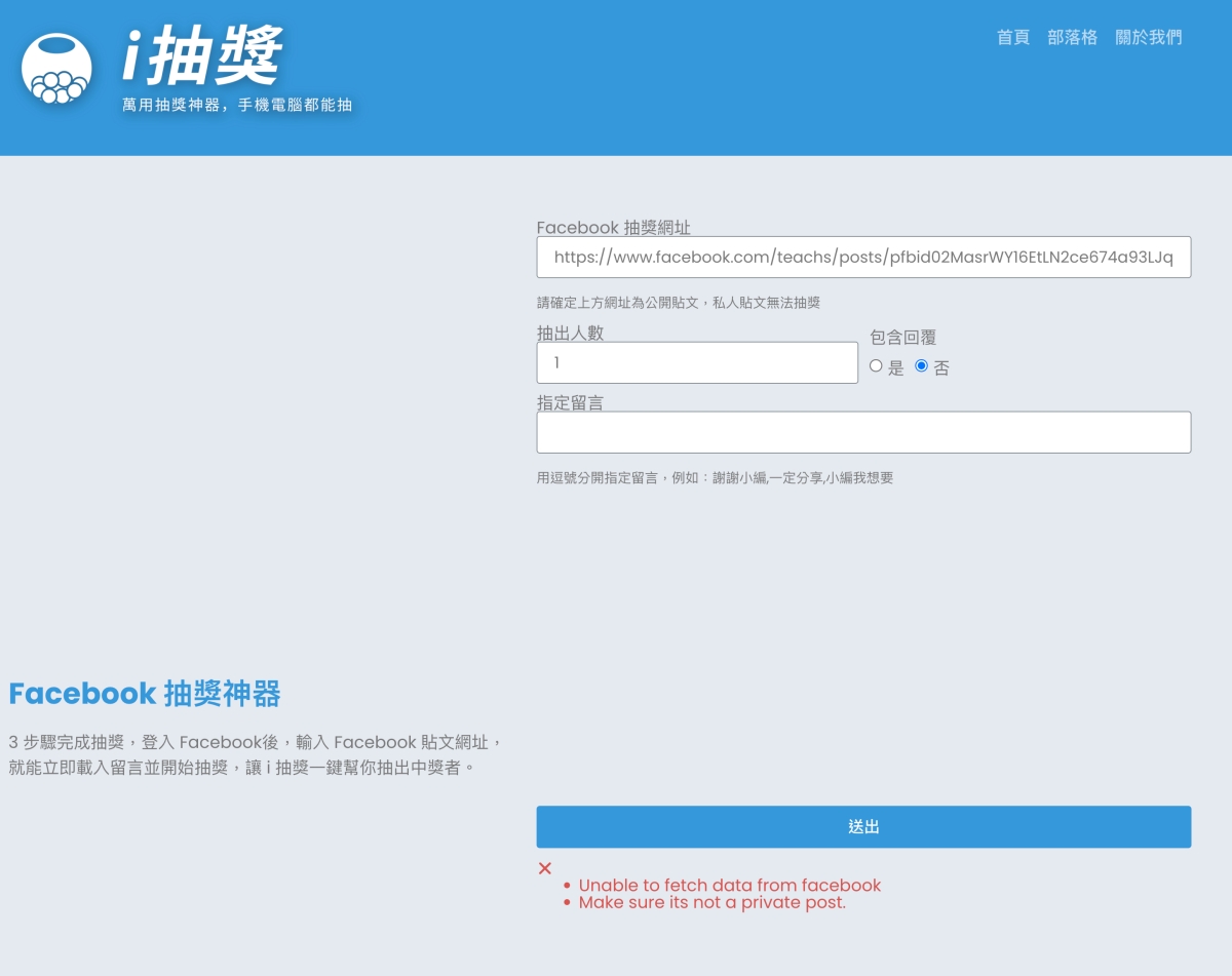 不過你會發現,不管怎麼試,都會出現錯誤訊息「Unable to fetch data from facebook」,這是因為 Facebook 機制的關係,導致很多抽獎功能都無法使用,那麼要怎麼使用呢?往下來看。
