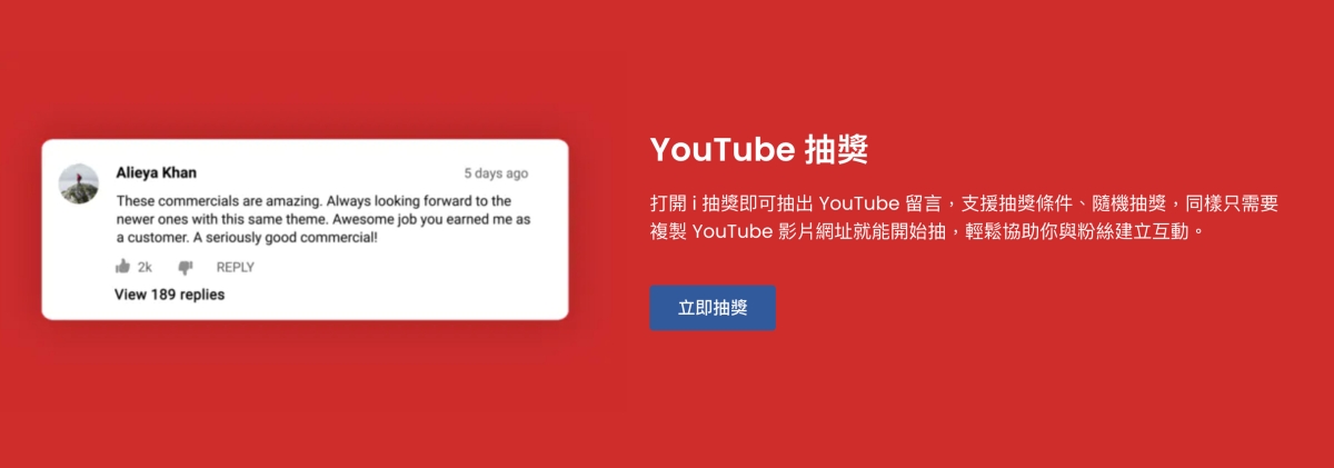 社群經營在早期很多都是透過抽獎操作來達成互動及粉絲的成長,雖然現在這樣做比較少,但偶而需要回饋粉絲或是促進互動率時,抽點小獎還是不可避免的,大多的社群抽獎功能都是支援 Facebook,而且是需要註冊登入或者收費,今天要分享的這款社群萬用的抽獎神器 i 抽獎,不需要註冊,免登入就可以使用,目前支援 Facebook、Instagram、YouTube、Twitter,對於有在經營社群的人是一大幫助,有需要的快來用看看吧。
