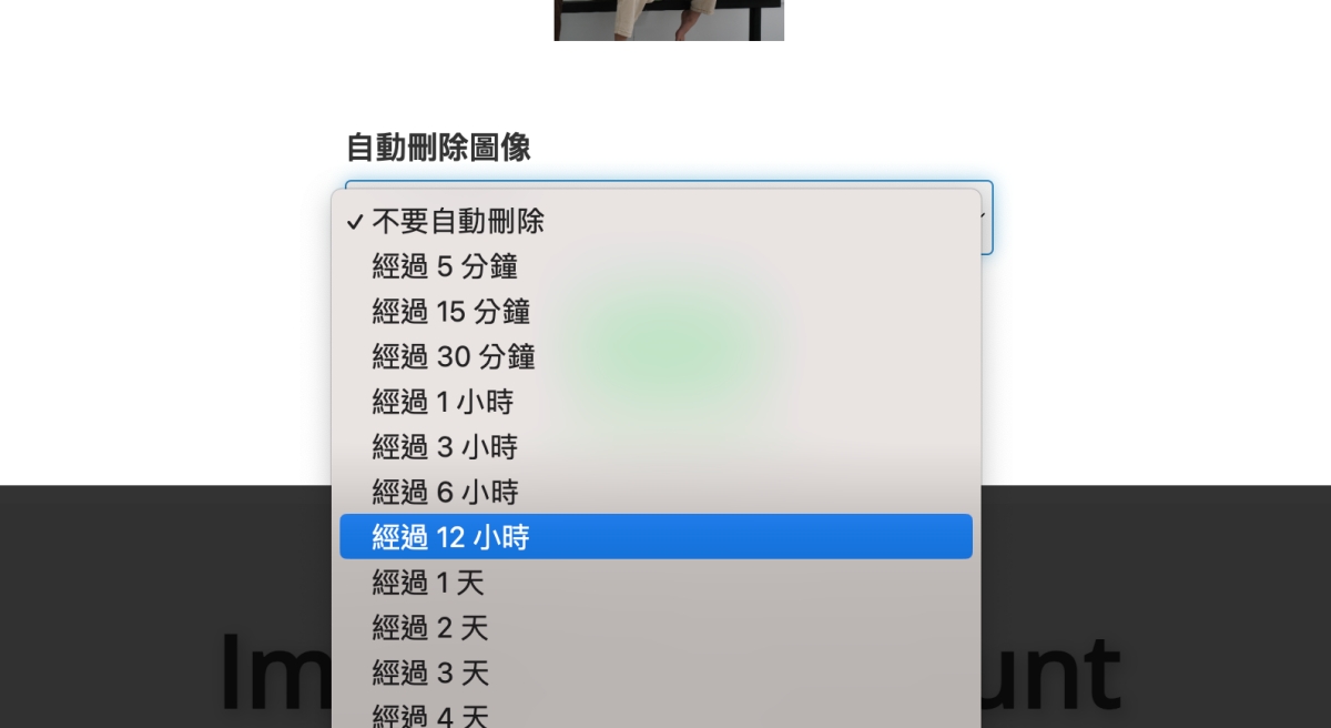 這邊就可以選擇最少 5 分鐘,最長可以很長的時間,自動刪除圖片,這樣分享給朋友後,也不用擔心一直留在網路上了。