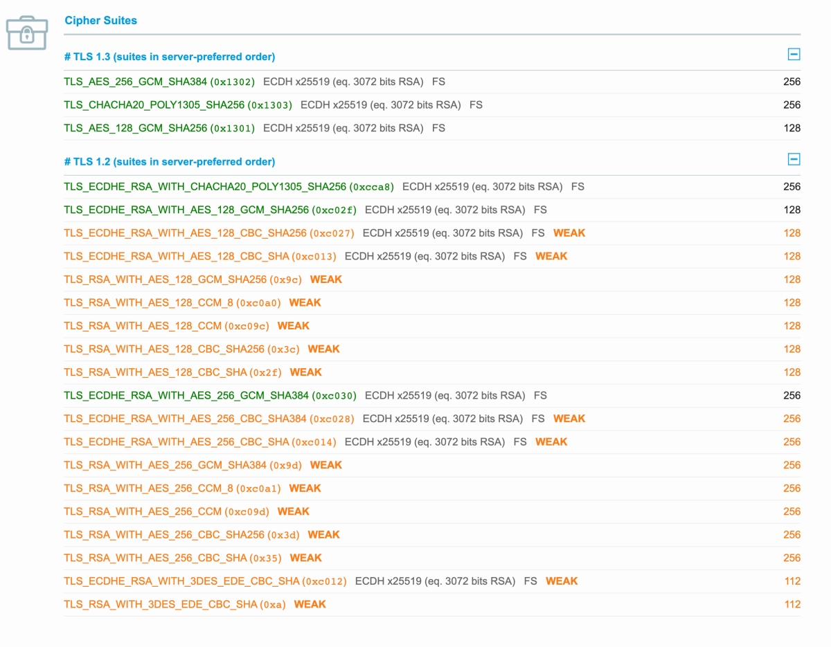 而這憑證檢測,還包括了很多細節,會告訴你哪些細項的安全性強度,如果看到 Weak 的項目,也可以研究一下怎麼調整,但大多是加密等級太低,只要重新加密,然後位元數高一點就好,不過呢,只要 A 以上,你的網站如果不是有重要帳密資訊會對外流通的話(特別是有會員的平台),其實加密等級不是太重要,提供給大家參考。