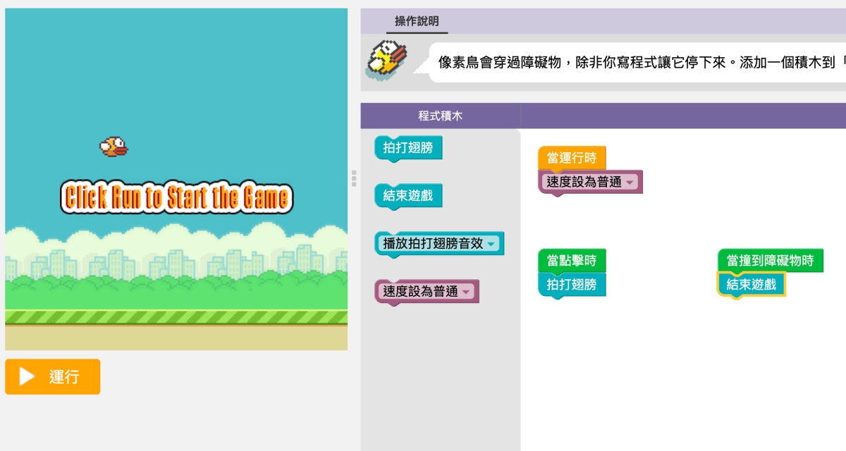 再來像是這個 Flappy 小遊戲,這算是很知名但不難的一款小遊戲,這邊進入後(如果是英文想切成中文,在左下角有語言可以選擇),就會一關一關帶你來了解程式基本結構,比如第一關是,當點擊畫面時,會有什麼效果,你只要把拍打翅膀拉到當點擊時的下方。