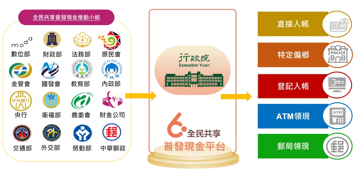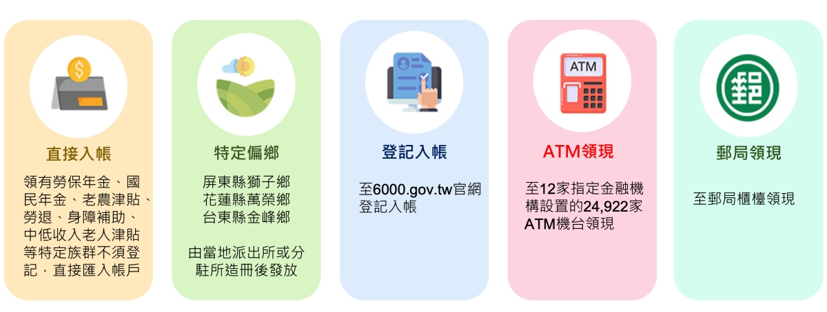 - 直接入帳:領有勞保年金、國民年金、老農津貼、勞退、身障輔助、中低收入老人津貼等特定族群,將會直接匯入帳戶,不須要做其它事情。
