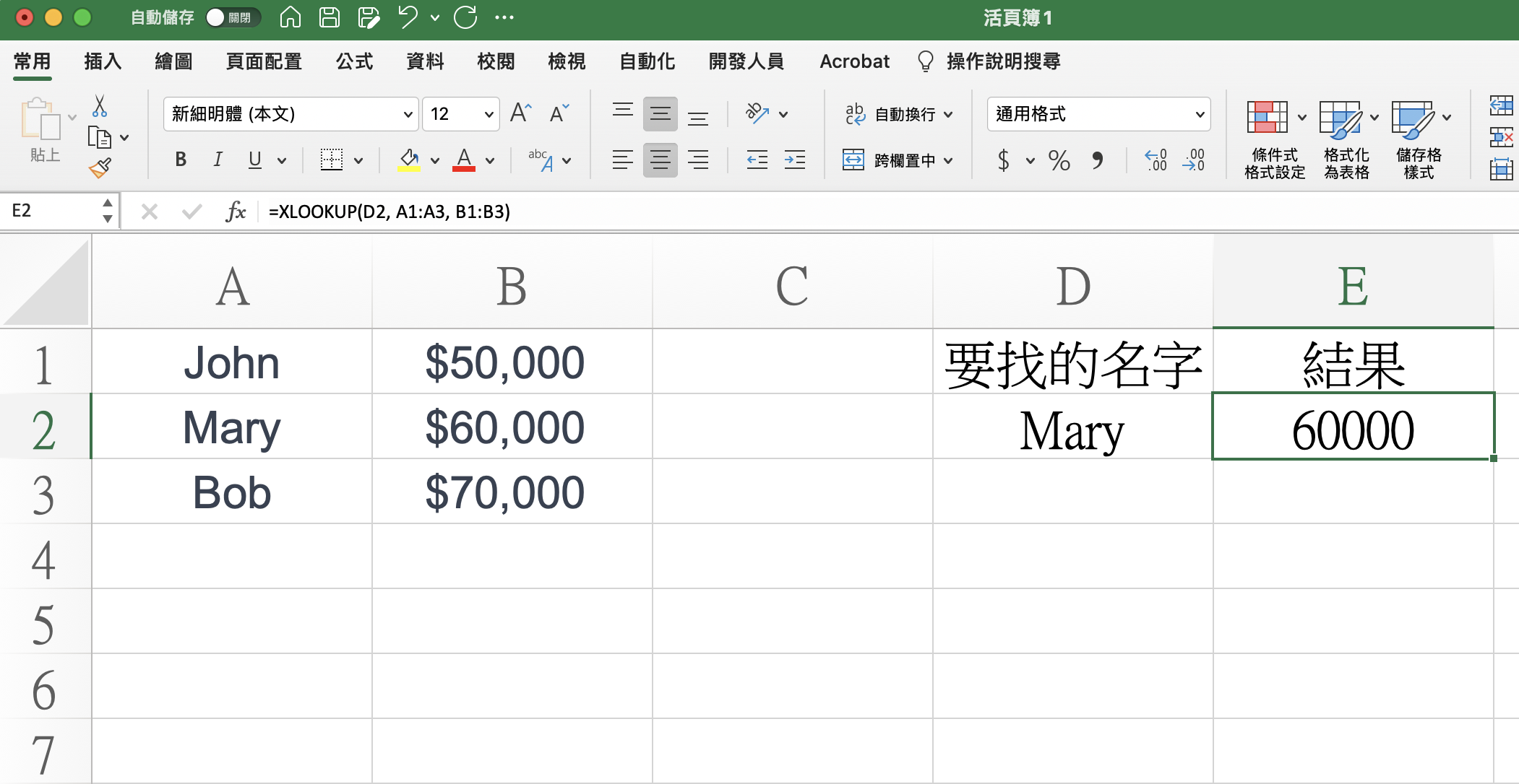 假設有一個員工名單,其中包含員工的姓名和薪資,你可以使用 XLOOKUP 函數根據姓名查找員工的薪資。假設員工名單如下表,你只要在 E 欄位填入公式:=XLOOKUP(D2, A1:A3, B1:B3)D2 欄位之後只要輸入要找的員工姓名,就會自動在 E2 顯示結果囉,比起以往的 Vlookup 是不是更加方便。