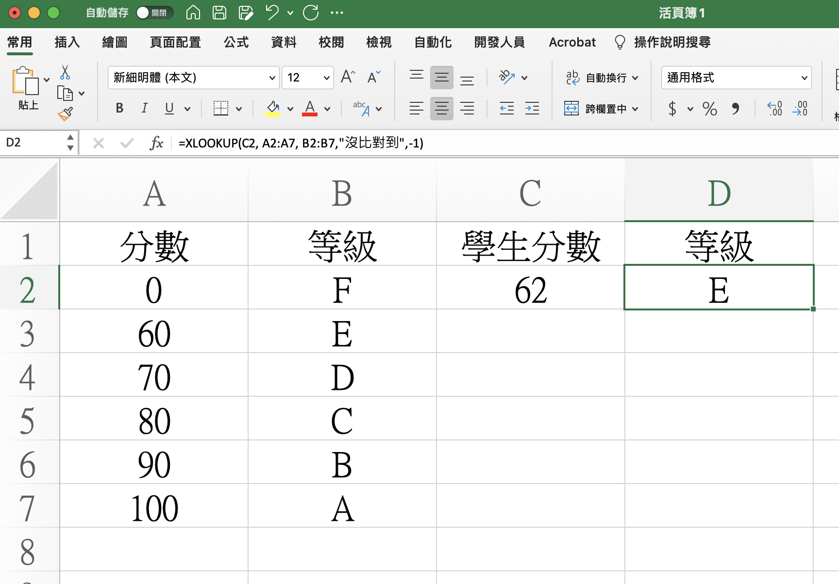 XLOOKUP 函數支援近似值配對。假設你有一個分數表,其中包含分數和相應的等級,你可以使用 XLOOKUP 函數根據分數查找相應的等級。假設分數和等級如下表,只要在 D2 填入公式:=XLOOKUP(C2, A2:A7, B2:B7,"沒比對到",-1)這麼一來只要在 C2 填入學生的分數就能自動比對等級出來,即便不是整數也沒問題,而第四個欄位填入的內容沒比對到,就是當資料不在比對範圍就顯示該內容,或者你也可以直接空白,像這樣: