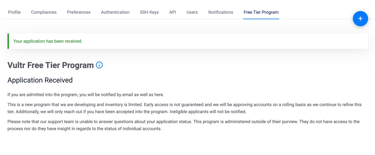 1 vCPU、0.5 GB RAM、10 GB SSD 儲存空間、2 TB 頻寬,只要完成付款綁定及帳號二階段驗證設定,就能向 Vultr 提出申請,當然這申請不是 100% 通過,他們應該還是會有自己的判斷再決定是否通過你的申請,不過依這樣的規格,對很多個人使用或微型創業是相當足夠的,有需要的可以申請看看。